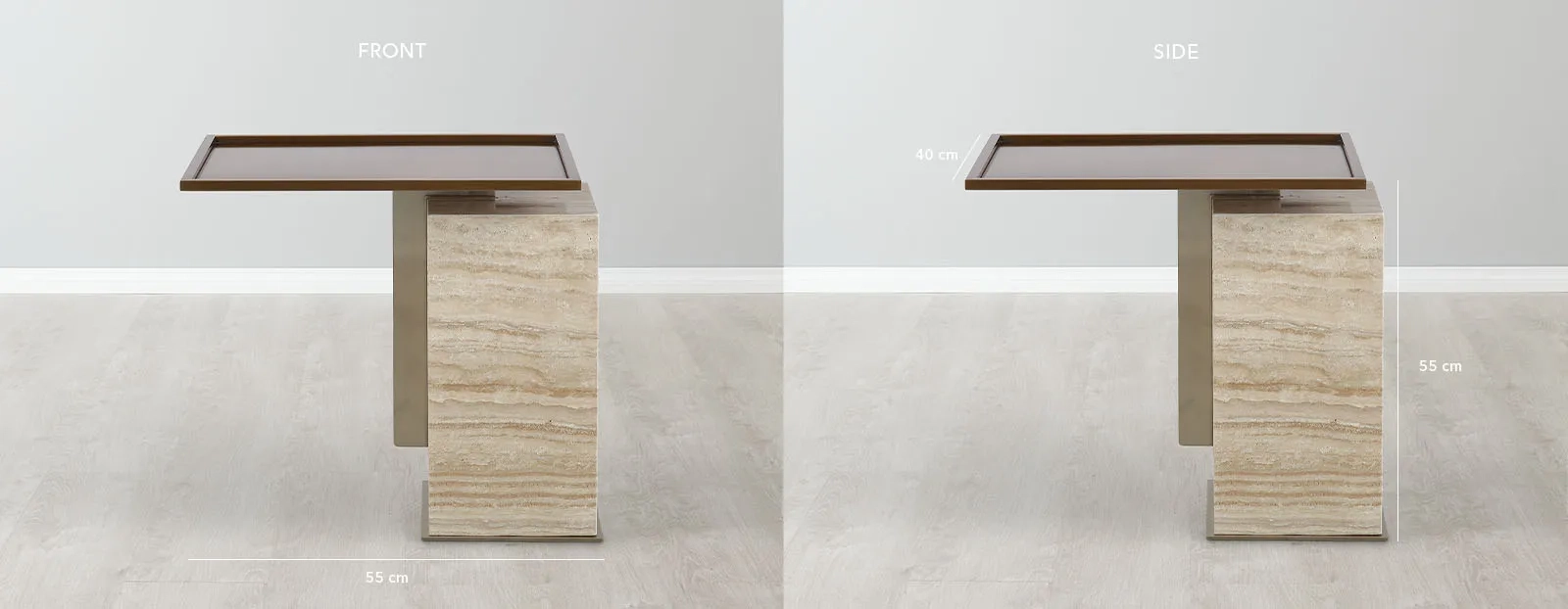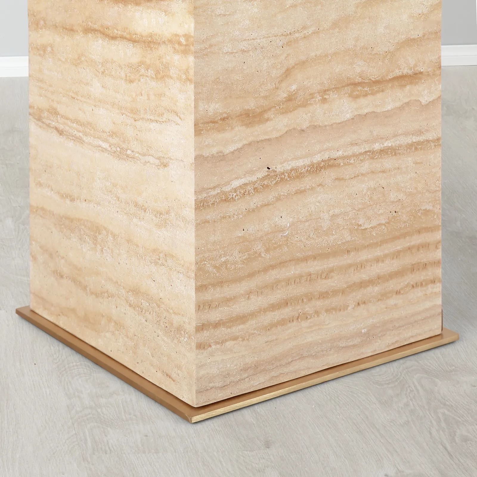 The side table features a sleek rectangular top, bordered by a thin brass trim that adds a touch of elegance and a modern contrast to the organic look of the travertine. The base's design is a thoughtful balance between the substantial presence of the stone and the refined finish of the metal, resulting in a piece that feels both grounded and sophisticated. With its clean lines and luxurious materials, the Monolith Natural Cream Travertine Side Table is more than just a surface to place your coffee cup; it's a statement piece that can anchor a room or add an understated opulence to a minimalist space.