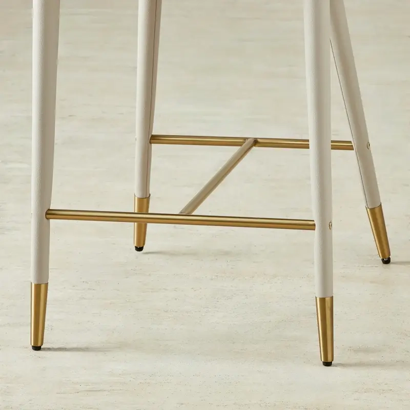 The open-back design encourages good posture while the padded seat and backrest provide comfortable support. A slim champagne gold metal frame connects the legs and serves as a practical footrest.