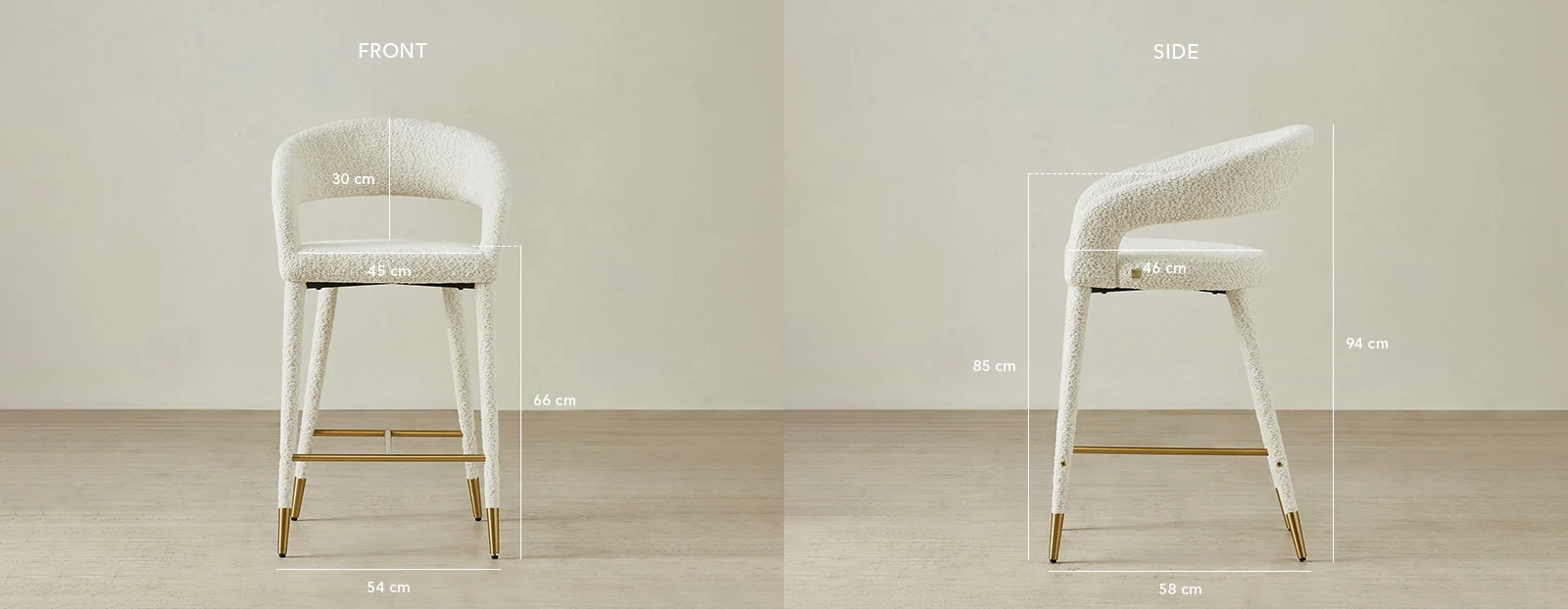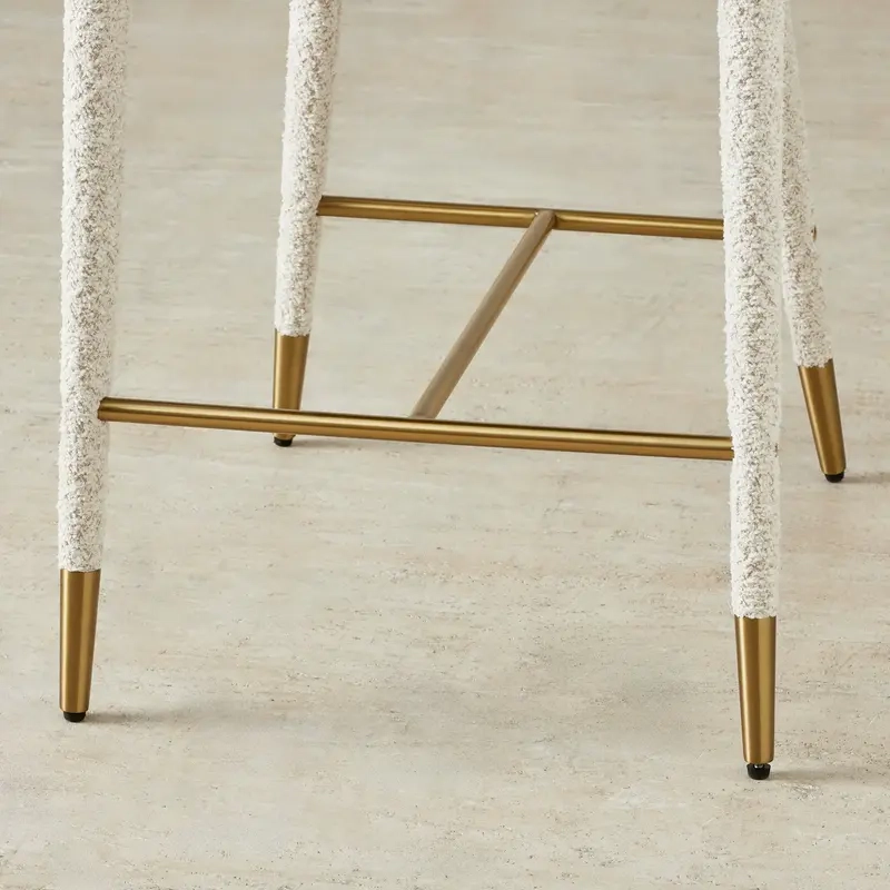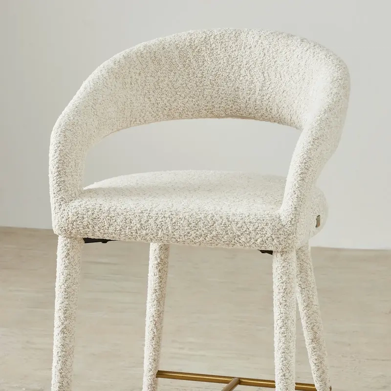 The Moulin Counter Stool offers understated elegance, upholstered in soft woven fabric in a versatile stone cream tone. Its mid-century inspired silhouette is defined by a graceful open back and slim angled legs in a champagne gold finish.