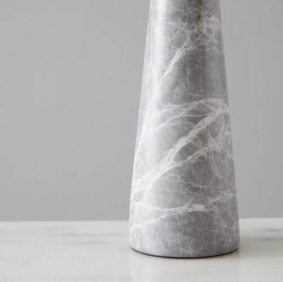 The Nadia Table Lamp is more than just a light fixture; it's an accent piece that transcends mere utility, elevating any room it inhabits. The lamp's foundation is a luxurious base of grey marble, shot through with delicate white veins that add a subtle depth and texture.