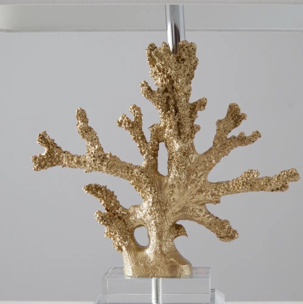 Yet, what truly elevates this lamp into a work of art is its resplendent body. Sculpted from finely crafted resin, it takes the shape of a stunning coral, each intricate detail elevated by a lavish covering of antique gold.