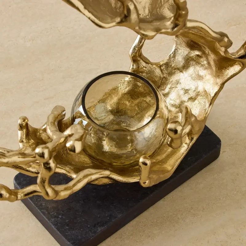 Each curve glows in deep gold tones, framing the votive at its heart like a suspended moment of light and warmth.