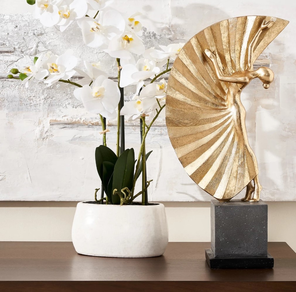 The sculpture's standout feature is the ballerina's skirt, expertly crafted to emulate a fan-like shape. Elevated to a ninety-degree angle, it captures a fleeting instant in a dance sequence, embodying a sense of movement and flow, even within the stillness of the resin.