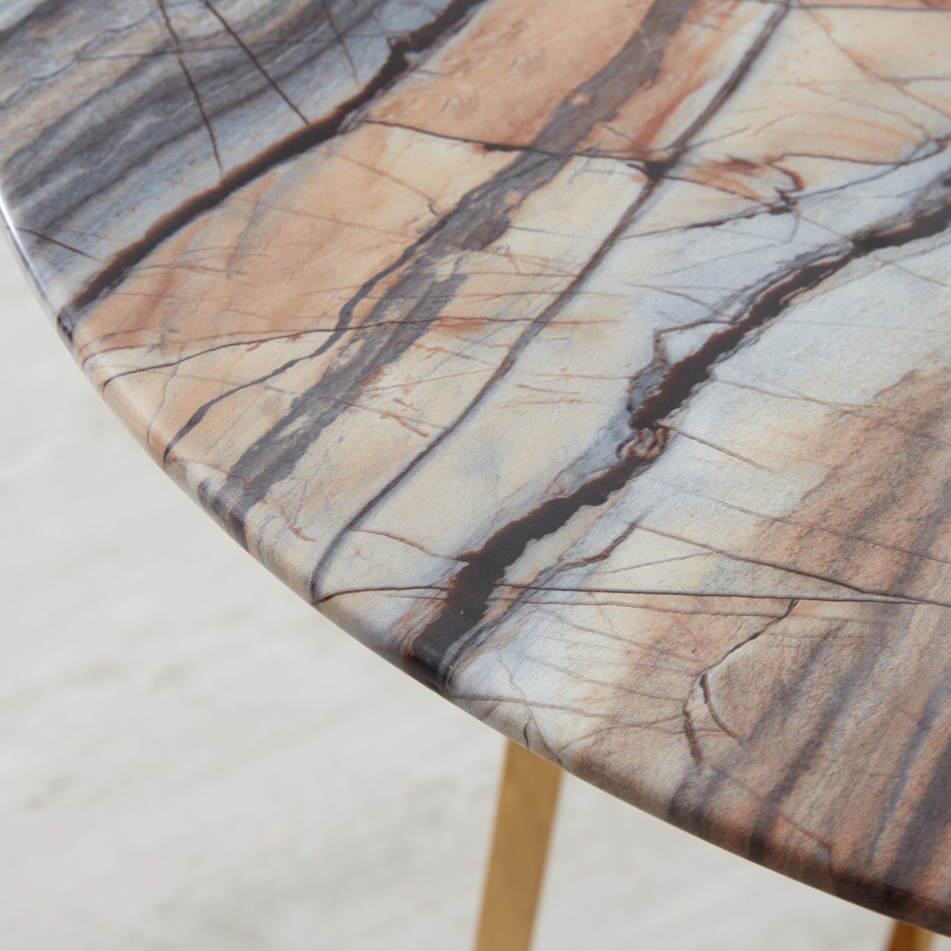 Experience the perfect blend of minimalism and luxury with the exceptional Odessa Bar Table. At its centre, a circular marble tabletop with patterned film and elegant veining offers a sleek and sophisticated focal point for your home bar.