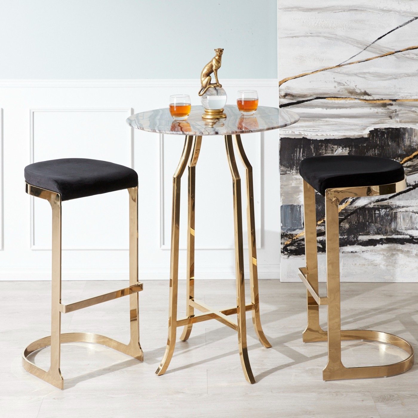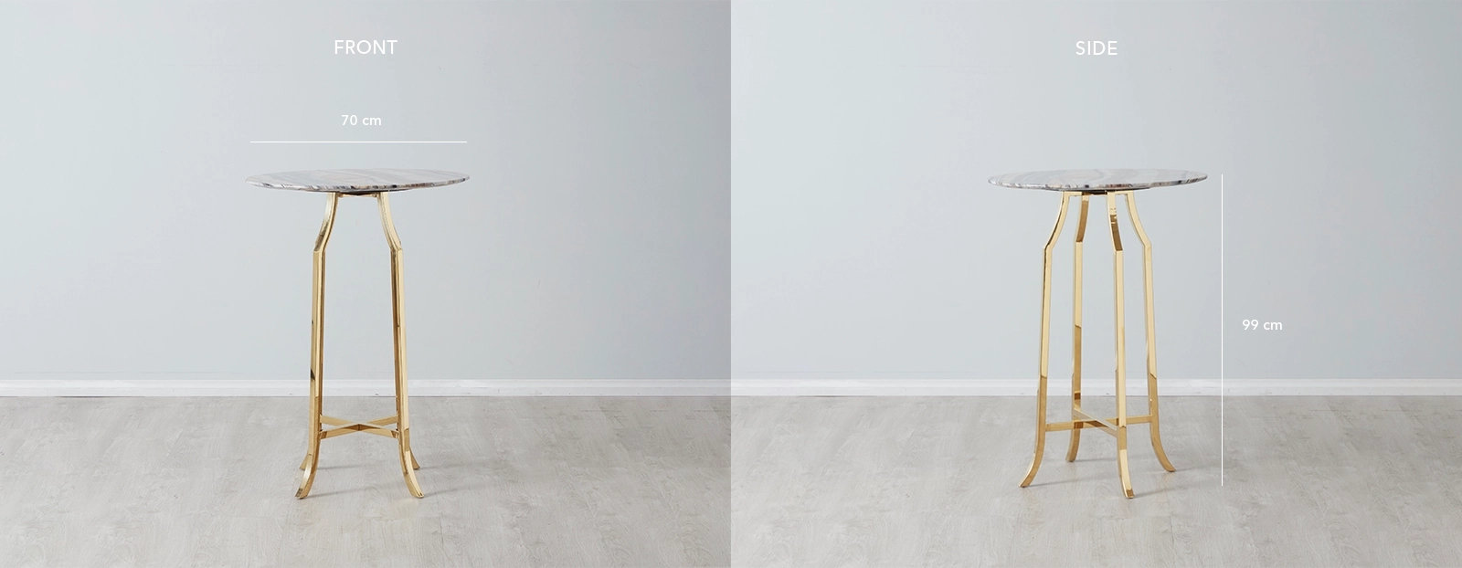 The Odessa Bar Table features a stunning circular form that brings a sense of balance and elegance to any space. Its sleek gold legs and frame add a touch of glamour, making it a striking centrepiece for your home bar.