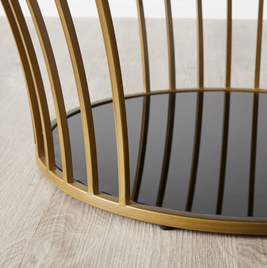 Supported by a stunning stainless-steel frame with a brushed bronze finish, combining stability and style. A black circular base complements the white marble, adding contrast, storage, and functionality to any living room.