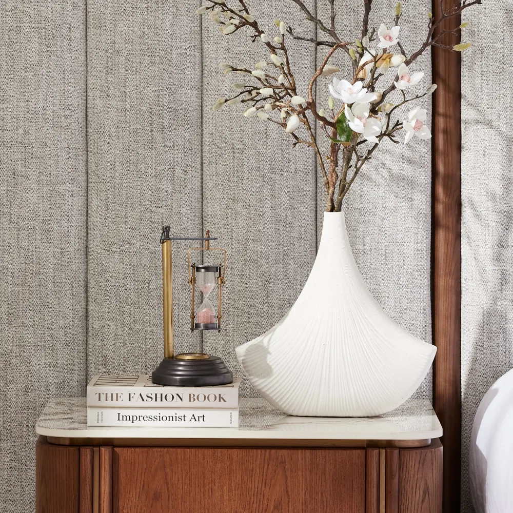 The Palmitas Vase presents a striking silhouette with its wide base tapering into a slender neck.