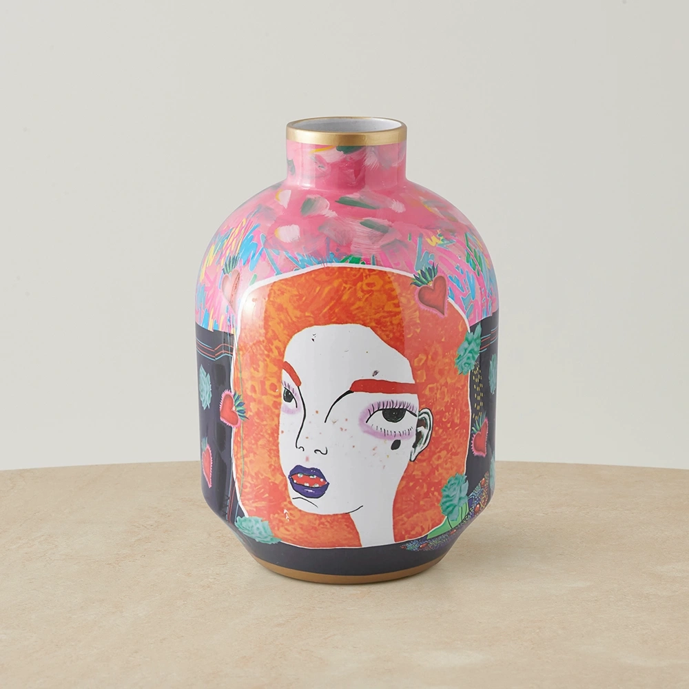 The Paloma Vase is a delightful and unique piece that brings a burst of whimsy and color to any room. It stands out not just as a functional vase but as a playful work of art, featuring a cartoonized depiction of a girl with vibrant red hair. This charming character is set against a psychedelic background teeming with floating hearts and cabbages, creating a scene that is both whimsical and visually captivating.