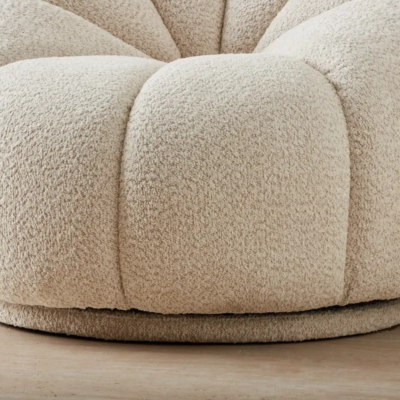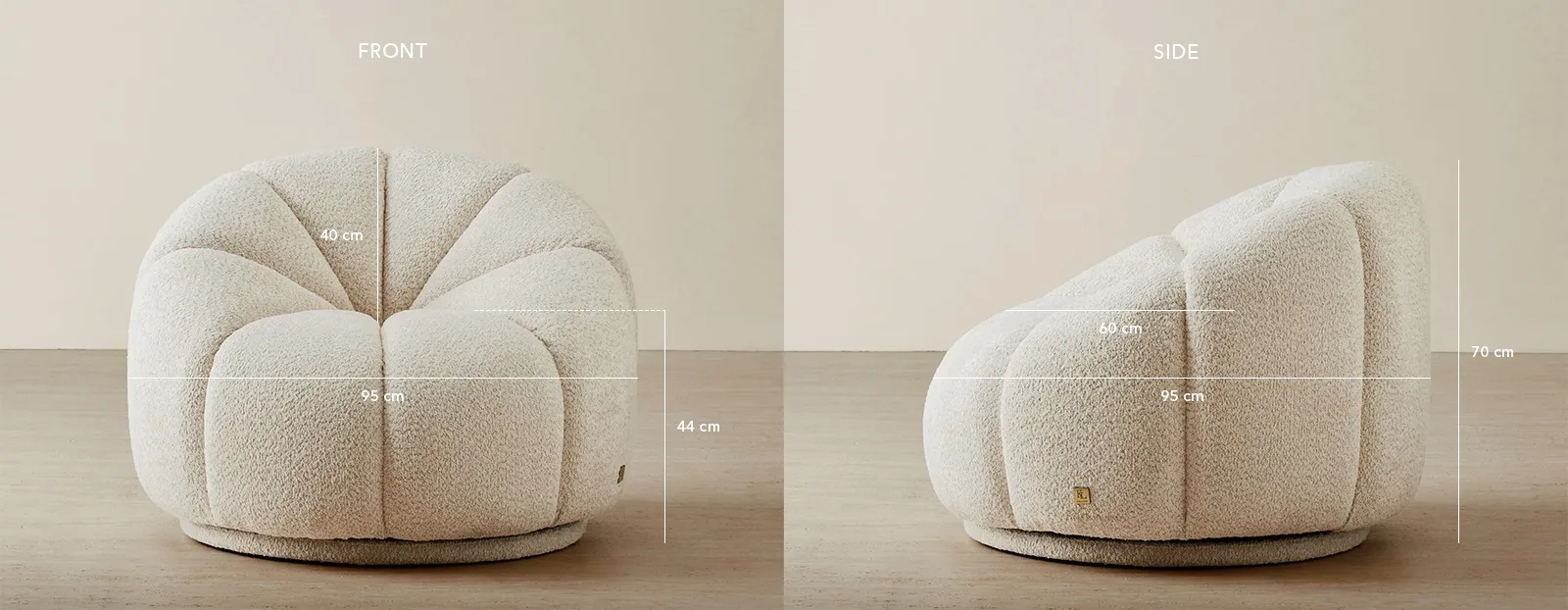 It features a unique tufted design that converges at an off-centre point for both comfort and elegance. Its streamlined frame and smooth swivel functionality bring a modern touch to any living space.