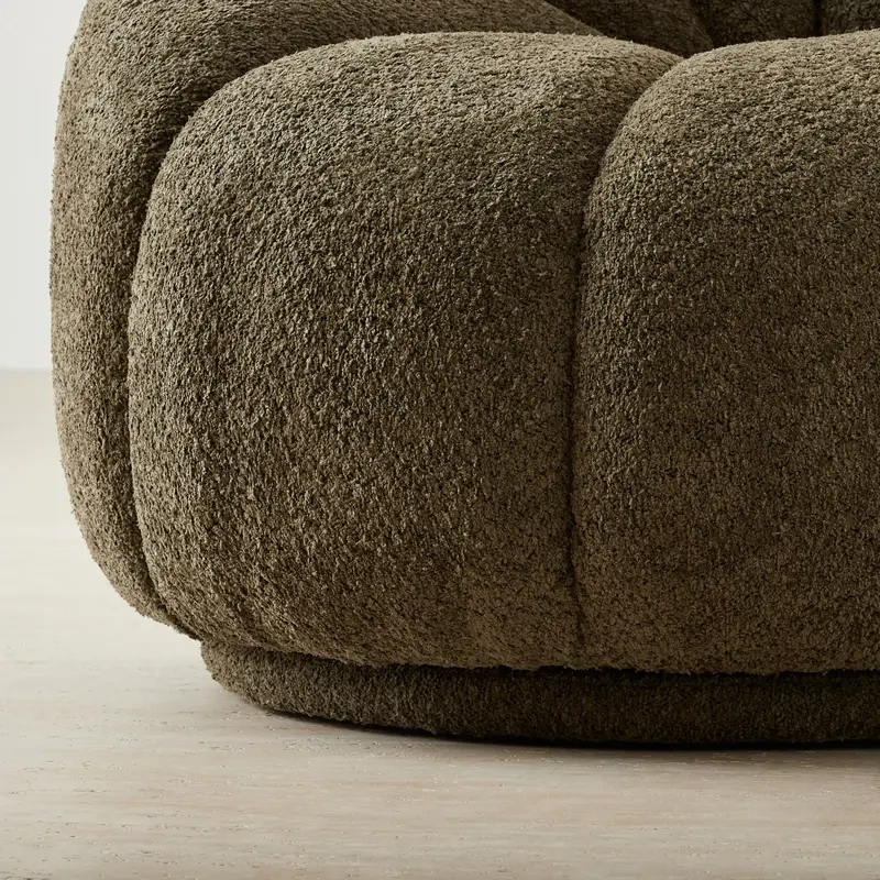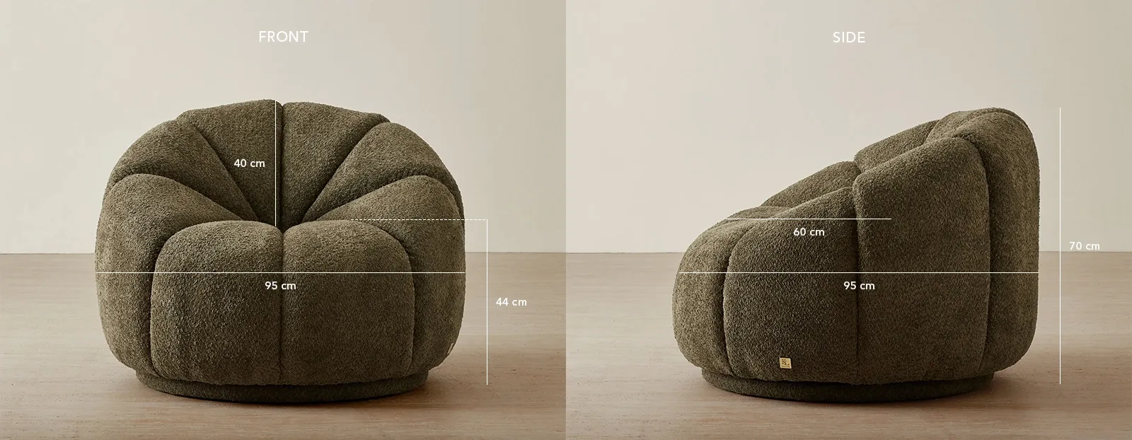 It features a unique tufted design that converges at an off-centre point for both comfort and elegance. Its streamlined frame and smooth swivel functionality bring a modern touch to any living space.