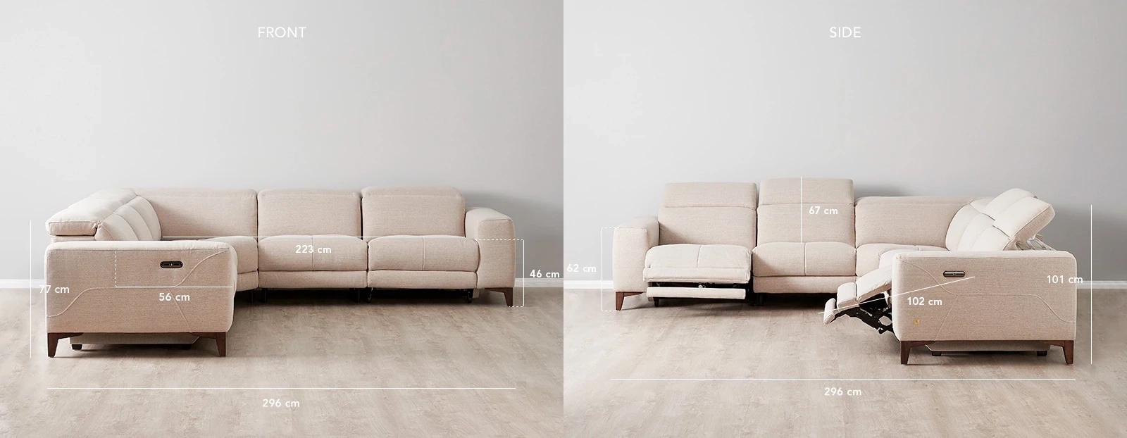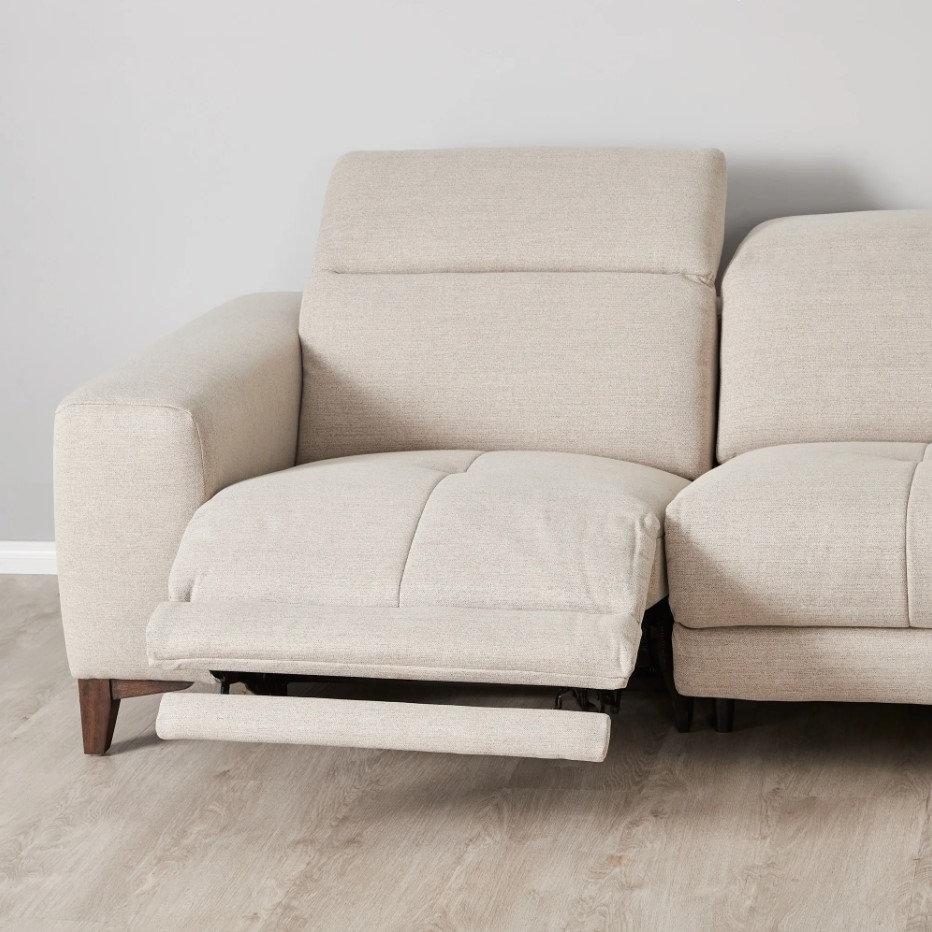 The Pierce Warm Grey Woven Fabric Corner Electric Recliner blends modern design with comfort. Its fine curves and angles create a stylish look, enhanced by the elegant warm grey woven fabric. The true appeal lies in its promise of unparalleled comfort.