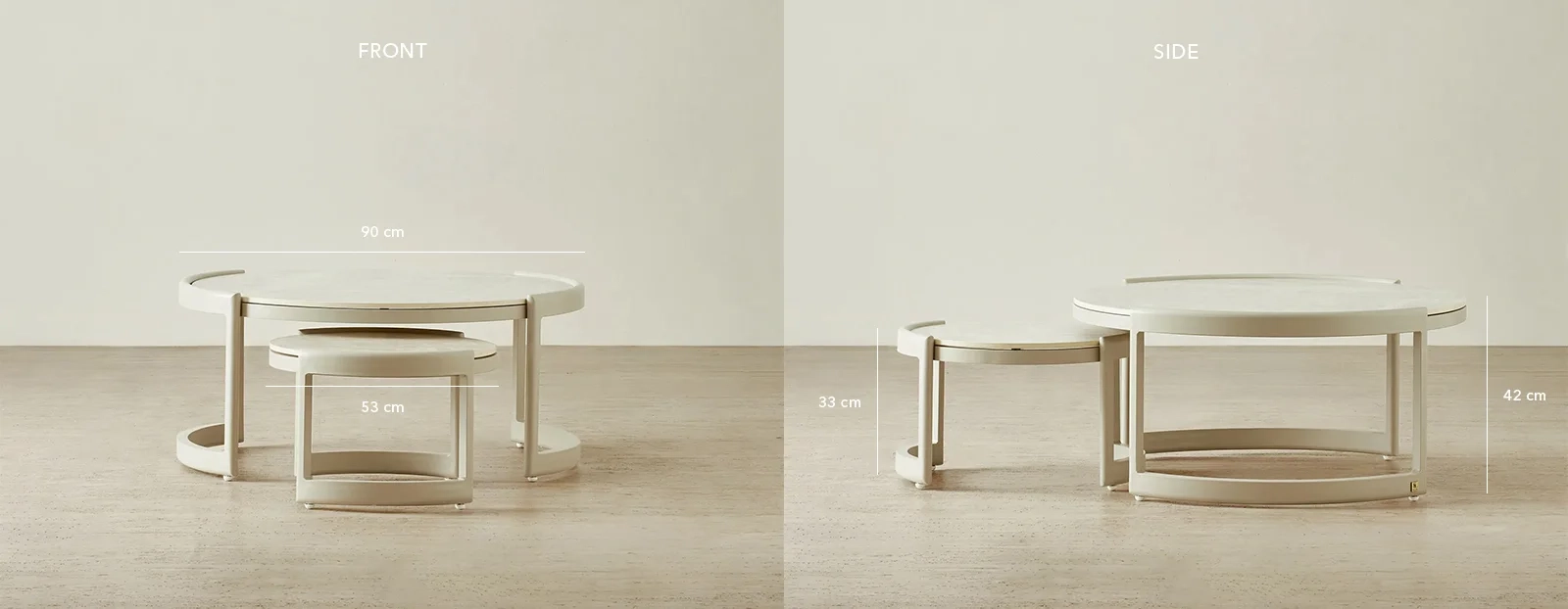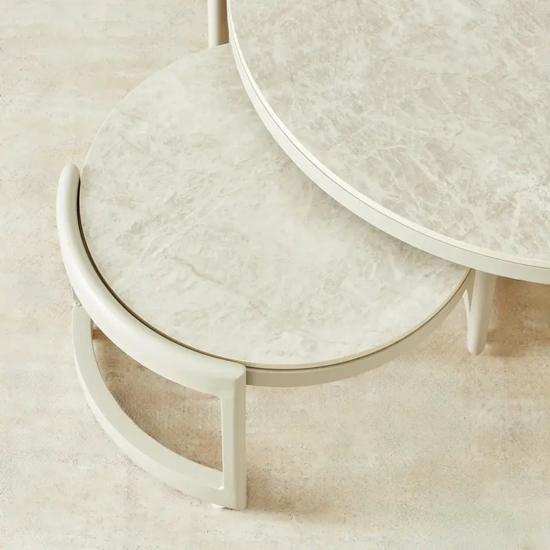 Perfect for modern living spaces, the round surfaces create a welcoming focal point while providing flexible arrangements for entertaining or everyday use. The sintered stone tops add a refined touch, blending durability with understated elegance.