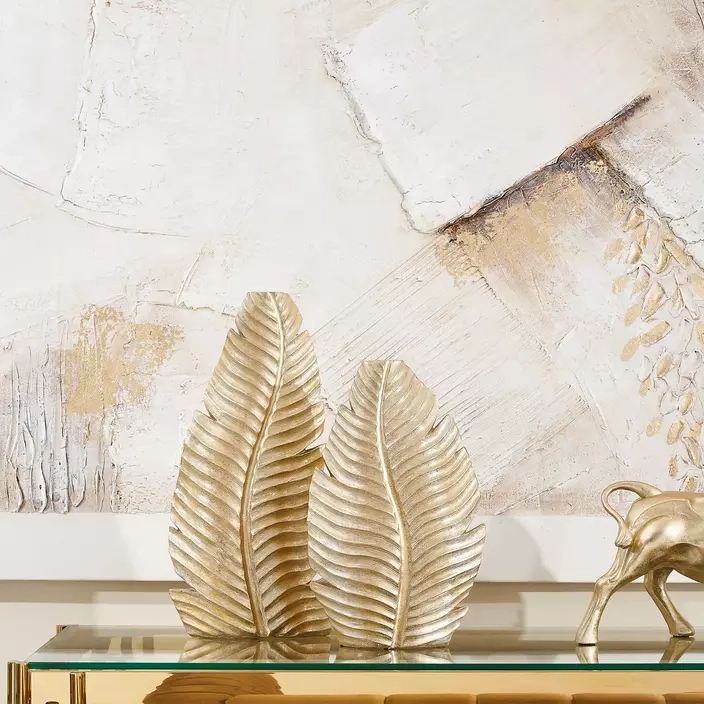 The vase glistens in a rich golden luster, highlighting each vein and edge with precision and opulence. The platano leaf, in various cultures, is often seen as a symbol of prosperity, growth, and renewal. Its broad expanse and intricate vein structure reflect nature's meticulous work and the cycle of life.