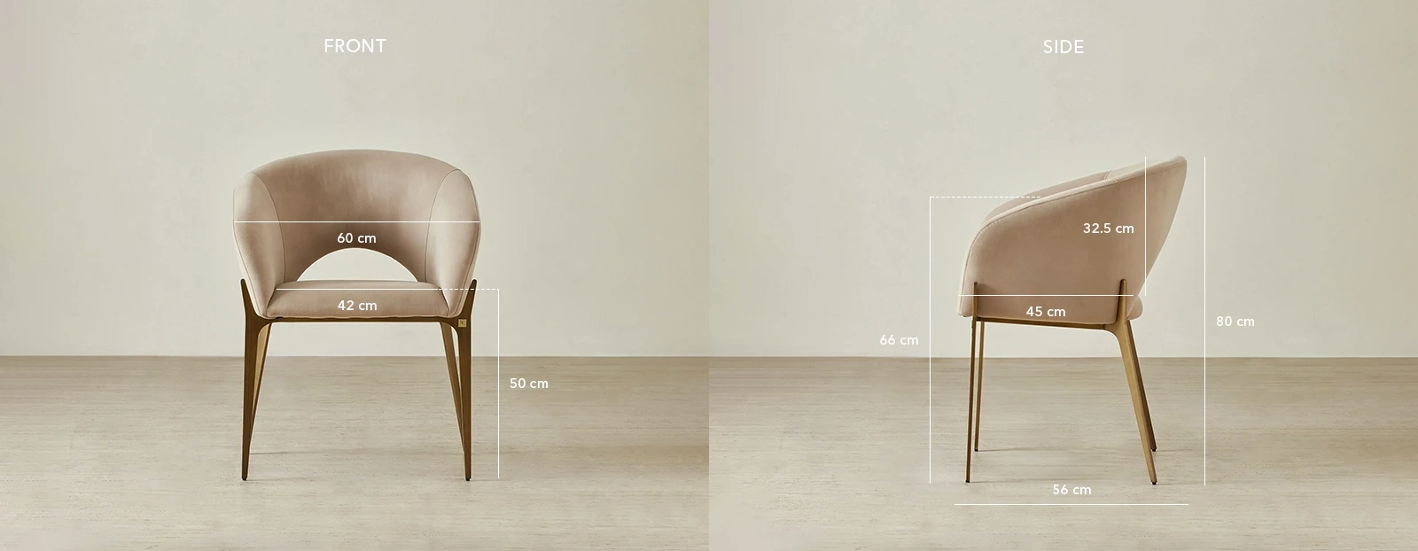 The Polina Dining Chair pairs soft light beige velvet with a gracefully curved backrest for a look that’s both modern and inviting. Its open-back design lends an airy elegance that complements a variety of dining spaces.