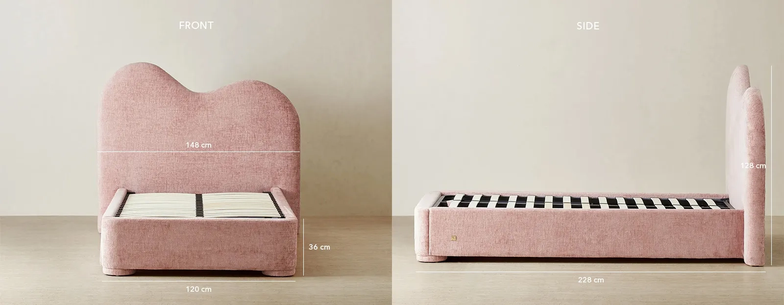 Its low frame and rounded edges create a grounded, balanced silhouette. Designed with intention, it brings a sense of calm and quiet luxury to the bedroom.