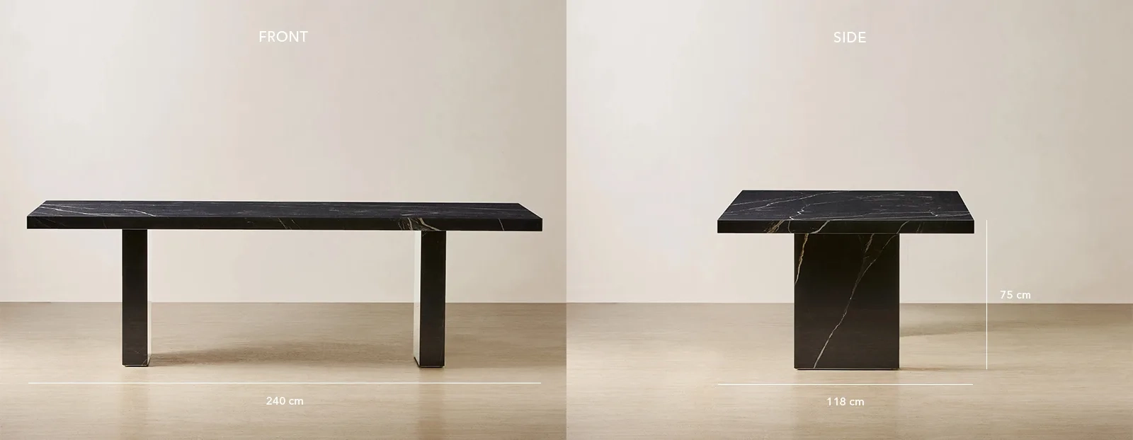 Its expansive 240×118 cm dimensions comfortably seat eight to ten people, making it ideal for family meals, celebrations, and elevated entertaining. With its commanding presence, it anchors the dining space with strength, sophistication, and contemporary refinement.