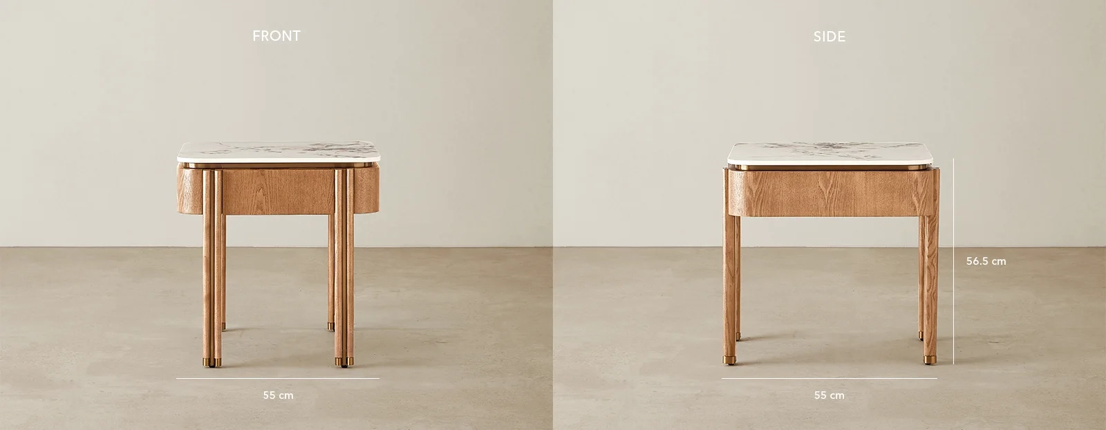 The Portobello II Side Table features a durable Pandora Brown sintered stone top, offering a sleek, easy-to-maintain surface with subtle natural veining.