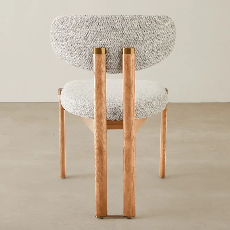 The light brown ash legs lend a grounded warmth, their clean lines enhancing the chair’s sculptural form. Subtle brass accents complete the design, bringing a quiet sophistication to any dining setting.