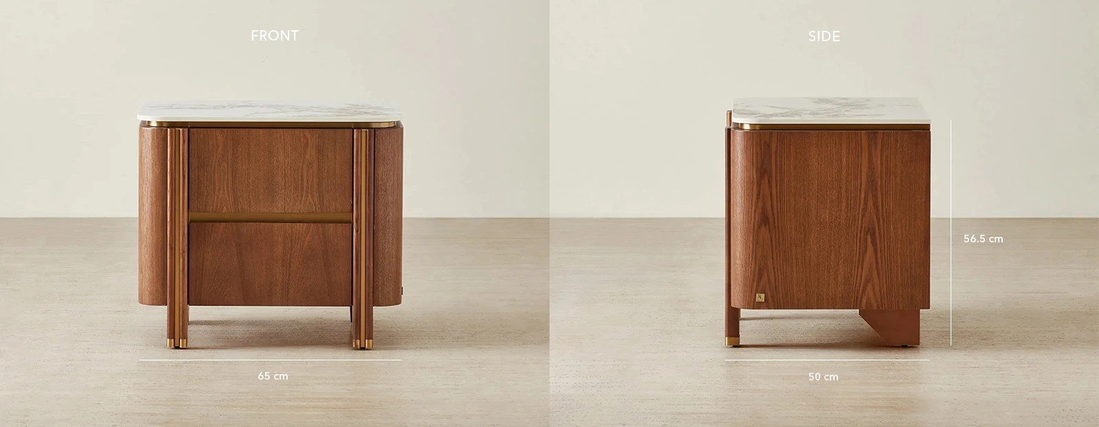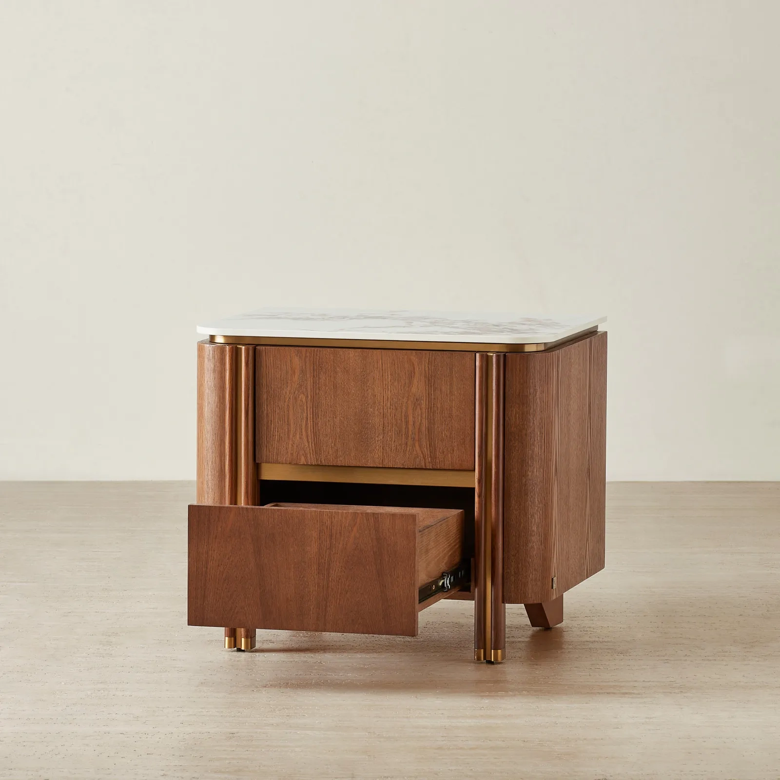 The Portobello II Toffee Brown Ash Veneer Bedside Table brings balance and simplicity to the bedroom. Its square form features a Pandora Brown sintered stone top.