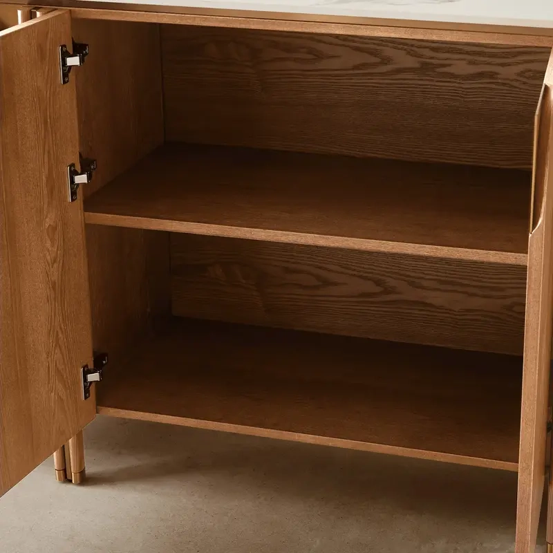 It features four cabinet doors that blend seamlessly with the wood's grain, revealing ample shelving for discreet storage. The interior shelves provide space for essentials, from fine china to multimedia accessories, all hidden in plain sight.