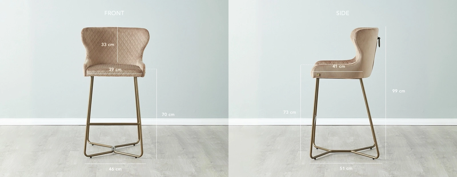 Elevate your interiors with the Quinn Bar Stools, a splendid amalgamation of simplicity and elegance. The Quinn Beige Velvet Bar Stool is more than just a seat - it's a statement of style, featuring a sleek seat upholstered in sophisticated Beige coloured velvet fabric. The striking criss-cross motif adorning the fabric enhances the stool's allure, imparting a layer of opulence to its overall aesthetic. This unique presentation, with its art-deco-inspired design, seamlessly infuses a dash of vintage glamour into contemporary home settings.