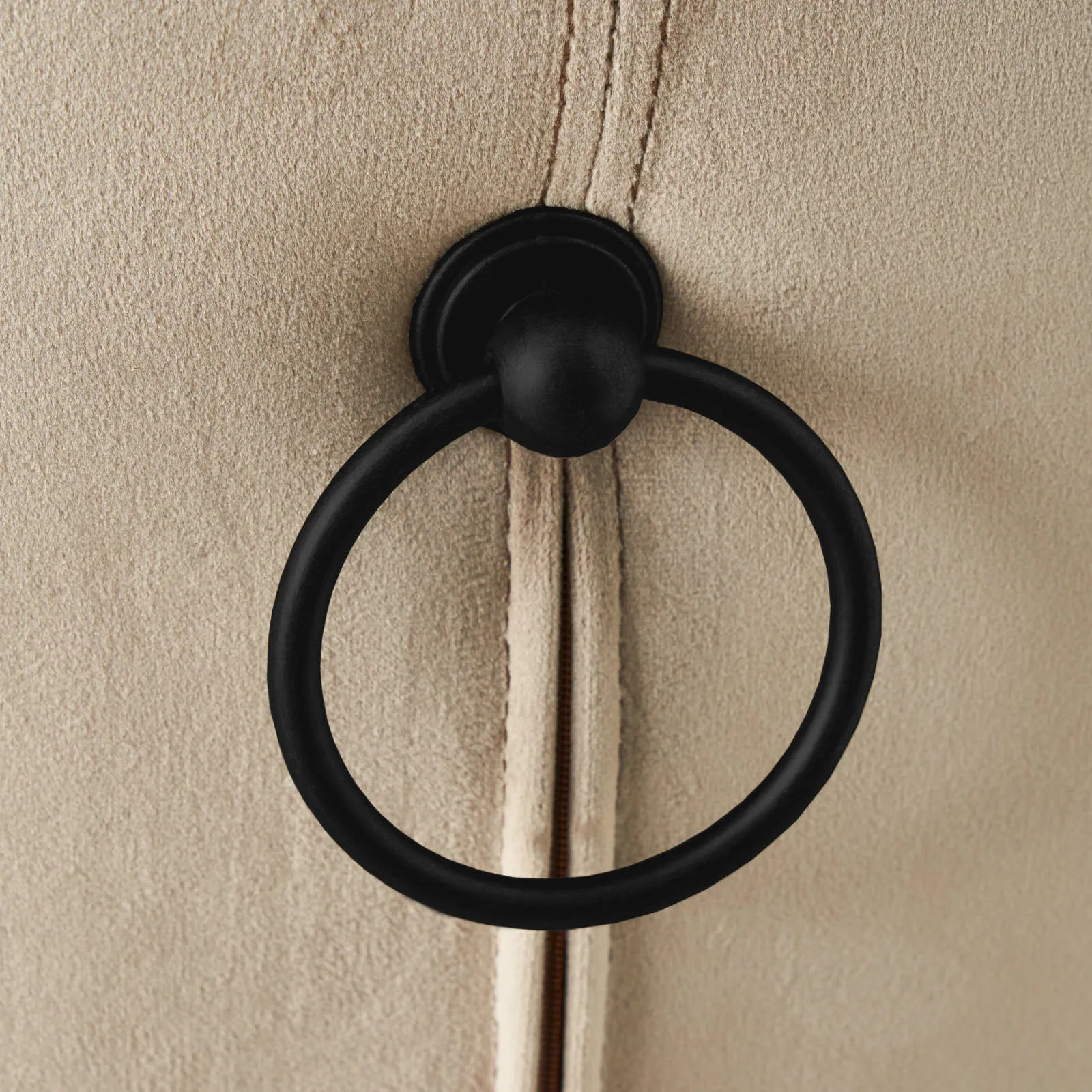 Slim Black Iron legs flow gracefully from the base, not only providing stability and support but also adding a touch of luxury to the Quinn Chair. Its sleek black-coloured finish complements the Beige-coloured seat beautifully, creating a beautiful contrast that exudes sophistication and refinement. To add a touch of character and uniqueness, a decorative pull ring is placed on the back of the chair. This small yet thoughtful detail adds a charming element to the overall design.