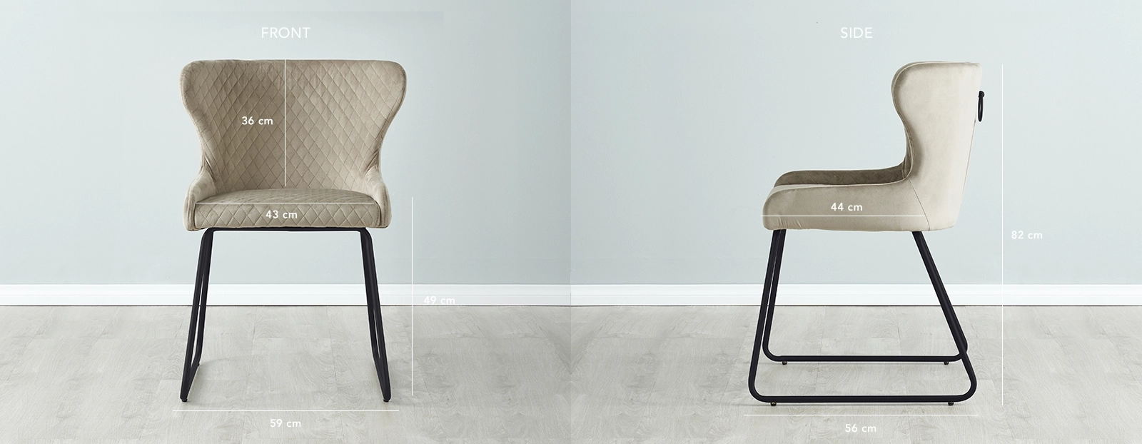 Liven up your homes with the captivating beauty of our Quinn Chairs. The Quinn Beige Velvet Dining Chair is a true embodiment of simplicity and elegance, offering a timeless design that effortlessly complements various interior styles. Its stylish Beige-coloured seat, made of luxurious velvet fabric, not only adds a touch of sophistication but also provides a comfortable seating experience. The mesmerizing cross-stitched design that adorns the entire seated area adds a touch of artistry and craftsmanship.