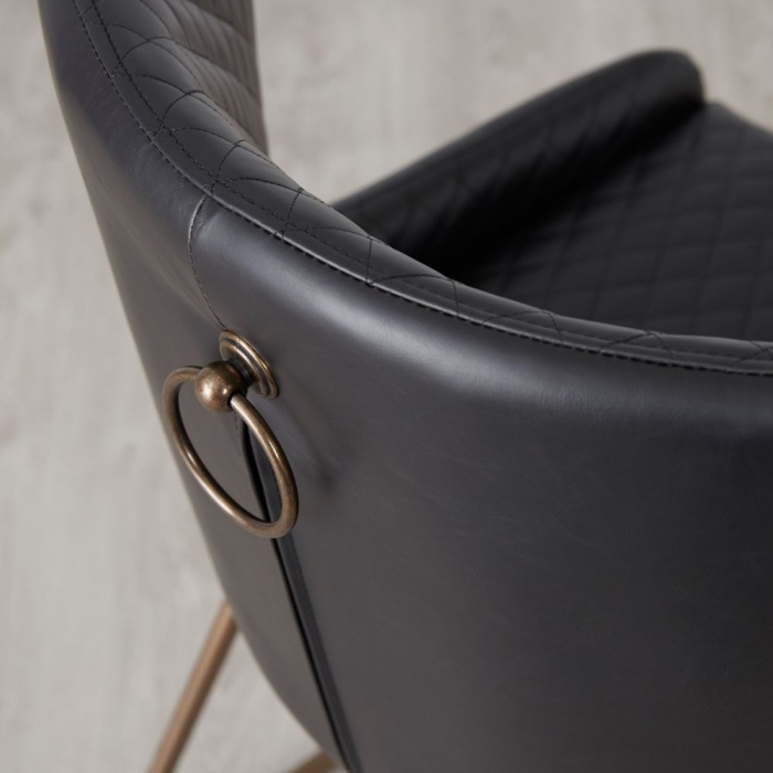 Elegant brass-colored legs flow gracefully from the base, not only providing stability and support but also adding a touch of luxury to the Quinn Chair. The warm and lustrous brass finish complements the black seat beautifully, creating a harmonious colour palette that exudes sophistication and refinement. To add a touch of character and uniqueness, a decorative pull ring is placed on the back of the chair. This small yet thoughtful detail adds a charming element to the overall design.