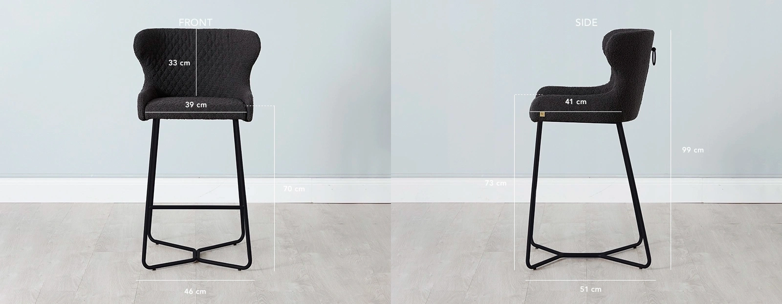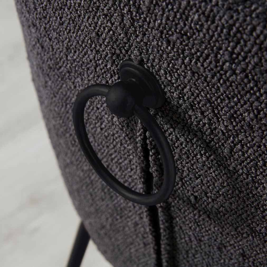 Meticulously crafted, a stylish black-coloured frame forms the sturdy base of the stool, complementing its charcoal boucle seat. This frame elegantly transitions into an integrated footrest, designed to ensure optimum comfort while enhancing the stool's stability. Adding a touch of whimsy and distinctiveness to the piece is a decorative pull ring on the back, contributing an additional layer of character to the stool's aesthetic appeal. The Quinn Charcoal Boucle Bar Stool is a medley of luxurious colours and stylized design that make it a thrilling addition to your home decor collection.