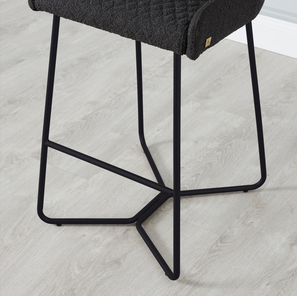 Elevate your interiors with the Quinn Bar Stools, a splendid amalgamation of simplicity and elegance. The Quinn Charcoal Boucle Bar Stool is more than just a seat - it's a statement of style, featuring a sleek seat upholstered in rich Charcoal Boucle Fabric. The striking criss-cross motif adorning the fabric enhances the stool's allure, imparting a layer of opulence to its overall aesthetic. This unique presentation, with its art-deco-inspired design, seamlessly infuses a dash of vintage glamour into contemporary home settings.