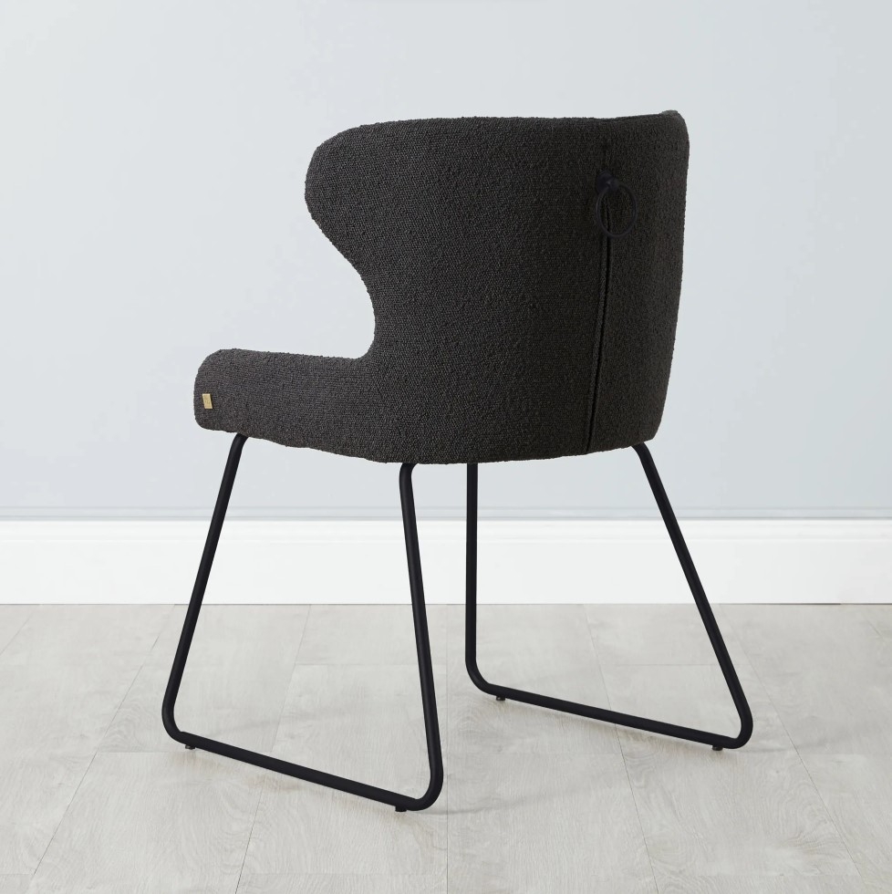 Slim Black Iron legs flow gracefully from the base, not only providing stability and support but also adding a touch of luxury to the Quinn Chair. Its sleek black coloured finish complements the charcoal seat beautifully, creating a harmonious colour palette that exudes sophistication and refinement. To add a touch of character and uniqueness, a decorative pull ring is placed on the back of the chair. This small yet thoughtful detail adds a charming element to the overall design.