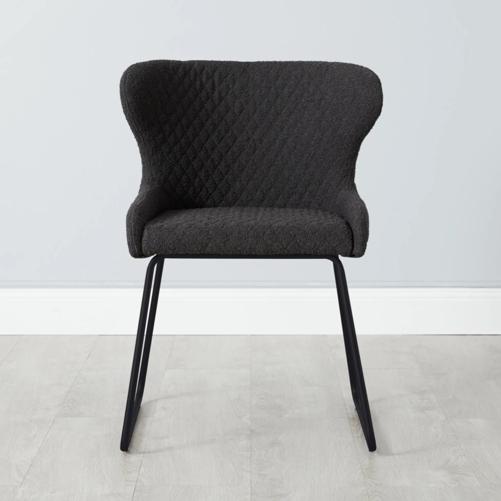Liven up your homes with the captivating beauty of our Quinn Chairs. The Quinn Charcoal Boucle Dining Chair is a true embodiment of simplicity and elegance, offering a timeless design that effortlessly complements various interior styles. Its stylish charcoal-coloured seat, made of soft boucle fabric, not only adds a touch of sophistication but also provides a cozy and comfortable seating experience. The mesmerizing cross-stitched design that adorns the entire seated area adds a touch of artistry and craftsmanship.