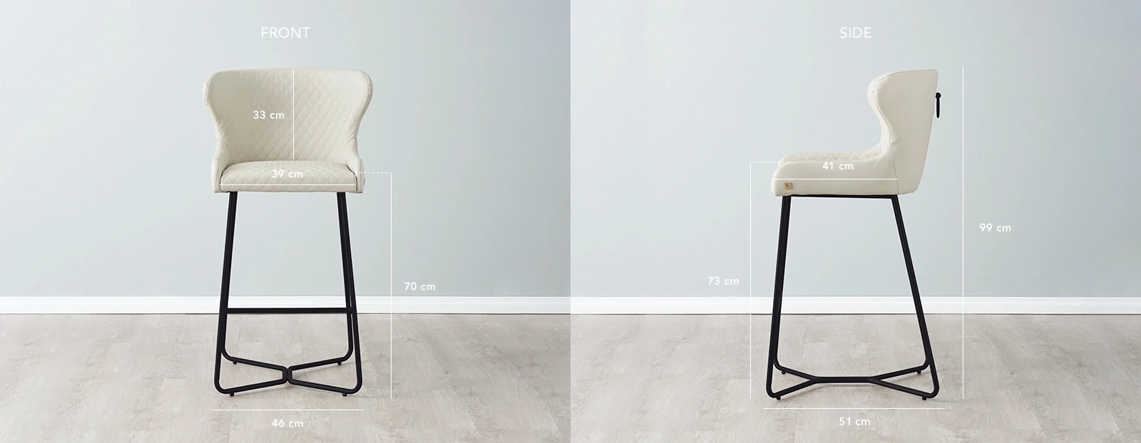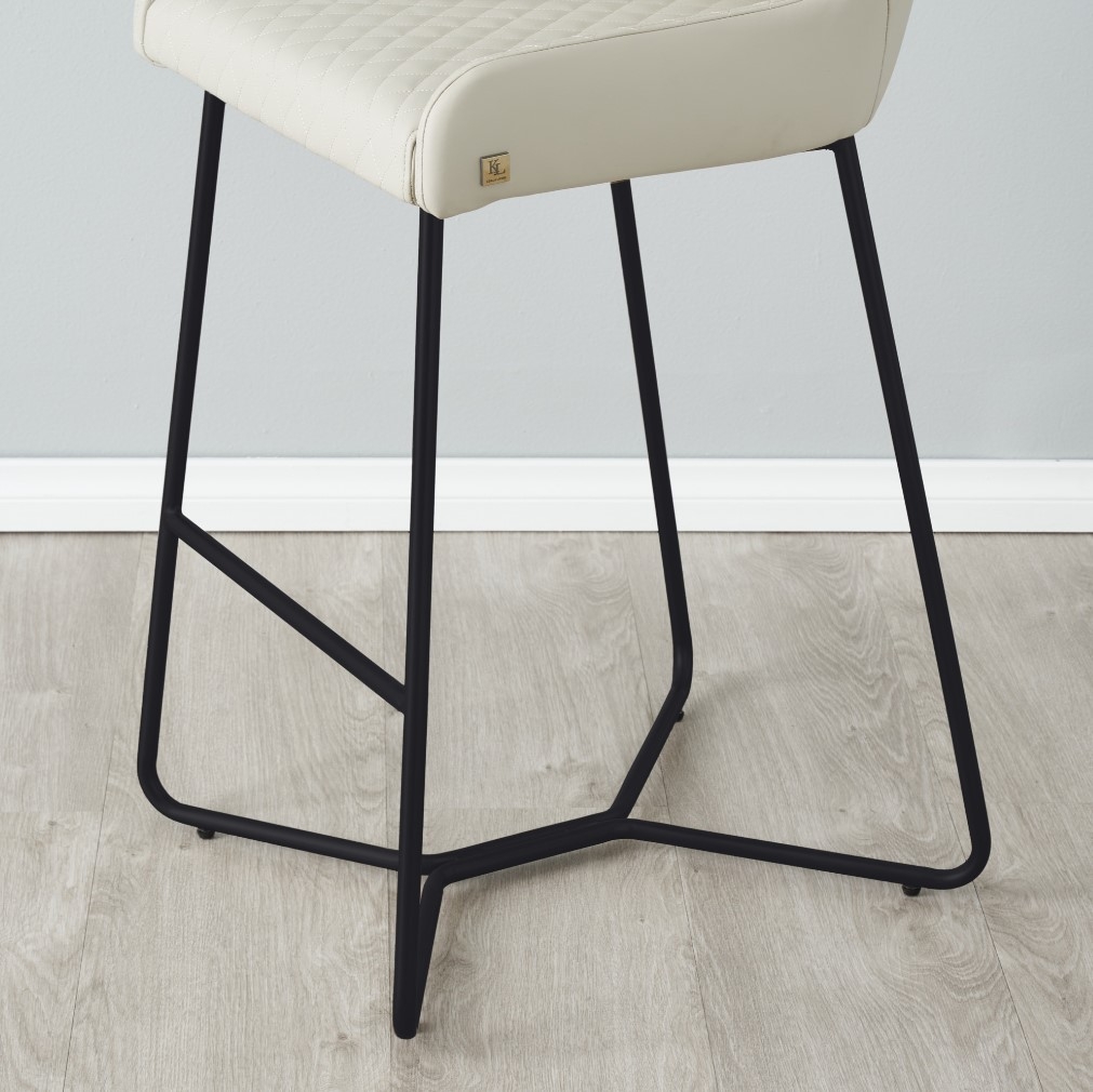 Elevate your interiors with the Quinn Bar Stools, a splendid amalgamation of simplicity and elegance. The Quinn Cloud Grey Vegan Leather Bar Stool is more than just a seat - it's a statement of style, featuring a sleek seat upholstered in exquisite Cloud Grey vegan leather. The striking criss-cross motif adorning the fabric enhances the stool's allure, imparting a layer of opulence to its overall aesthetic. This unique presentation, with its art-deco-inspired design, seamlessly infuses a dash of vintage glamour into contemporary home settings.