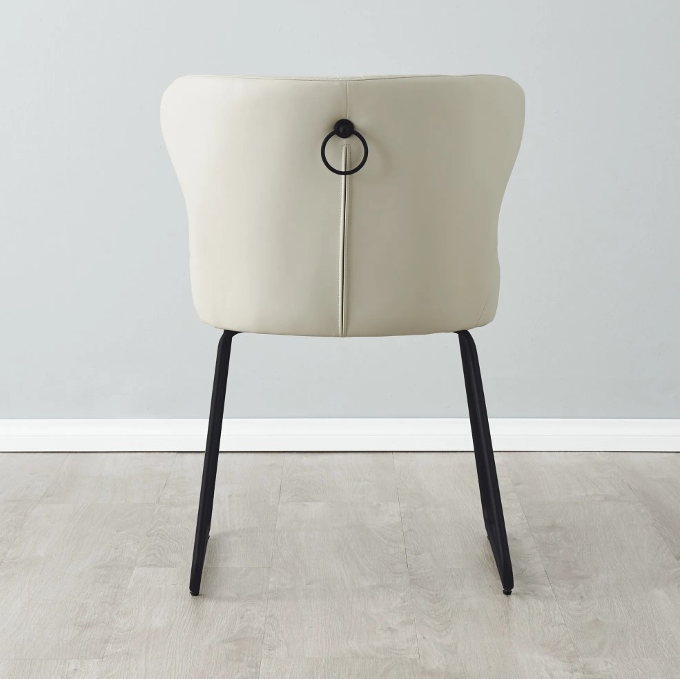 Slim Black Iron legs flow gracefully from the base, not only providing stability and support but also adding a touch of luxury to the Quinn Chair. Its sleek black-coloured finish complements the Cloud Grey-coloured seat beautifully, creating a beautiful contrast that exudes sophistication and refinement. To add a touch of character and uniqueness, a decorative pull ring is placed on the back of the chair. This small yet thoughtful detail adds a charming element to the overall design.