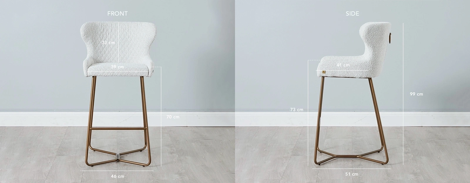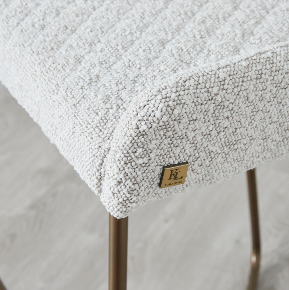 Meticulously crafted, a stylish brass-coloured frame forms the sturdy base of the stool, complementing its rich cream coloured seat. This frame elegantly transitions into an integrated footrest, designed to ensure optimum comfort while enhancing the stool's stability. Adding a touch of whimsy and distinctiveness to the piece is a decorative pull ring on the back, contributing an additional layer of character to the stool's aesthetic appeal. The Quinn Cream Boucle Bar Stool is a medley of luxurious colours and stylized design that make it a thrilling addition to your home decor collection.