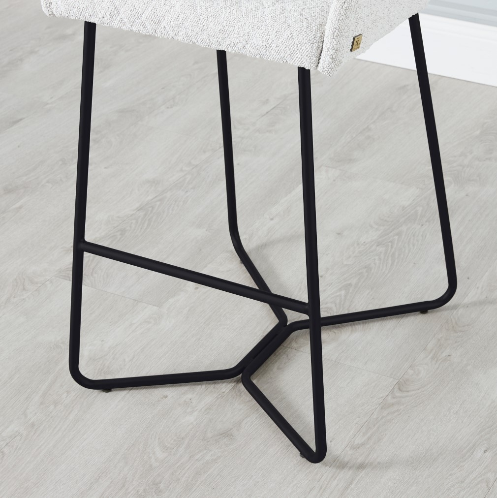 Elevate your interiors with the Quinn Bar Stools, a splendid amalgamation of simplicity and elegance. The Quinn Cream Boucle Bar Stool is more than just a seat - it's a statement of style, featuring a sleek seat upholstered in inviting Cream coloured Boucle fabric. The striking criss-cross motif adorning the fabric enhances the stool's allure, imparting a layer of opulence to its overall aesthetic. This unique presentation, with its art-deco-inspired design, seamlessly infuses a dash of vintage glamour into contemporary home settings.