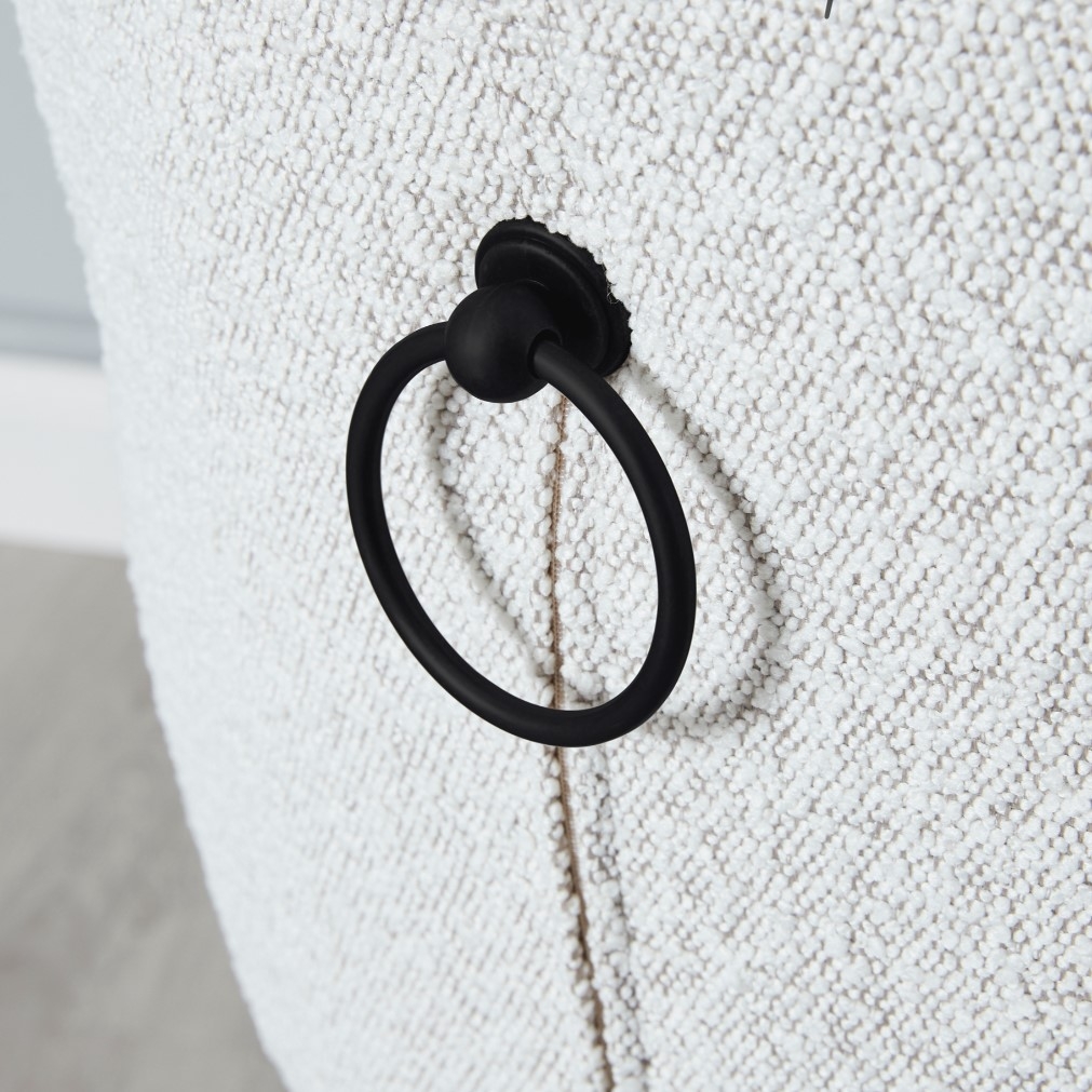 Meticulously crafted, a stylish black frame forms the sturdy base of the stool, complementing its rich cream-coloured seat. This frame elegantly transitions into an integrated footrest, designed to ensure optimum comfort while enhancing the stool's stability. Adding a touch of whimsy and distinctiveness to the piece is a decorative pull ring on the back, contributing an additional layer of character to the stool's aesthetic appeal. The Quinn Cream Boucle Bar Stool is a medley of luxurious colours and stylized design that make it a thrilling addition to your home decor collection.