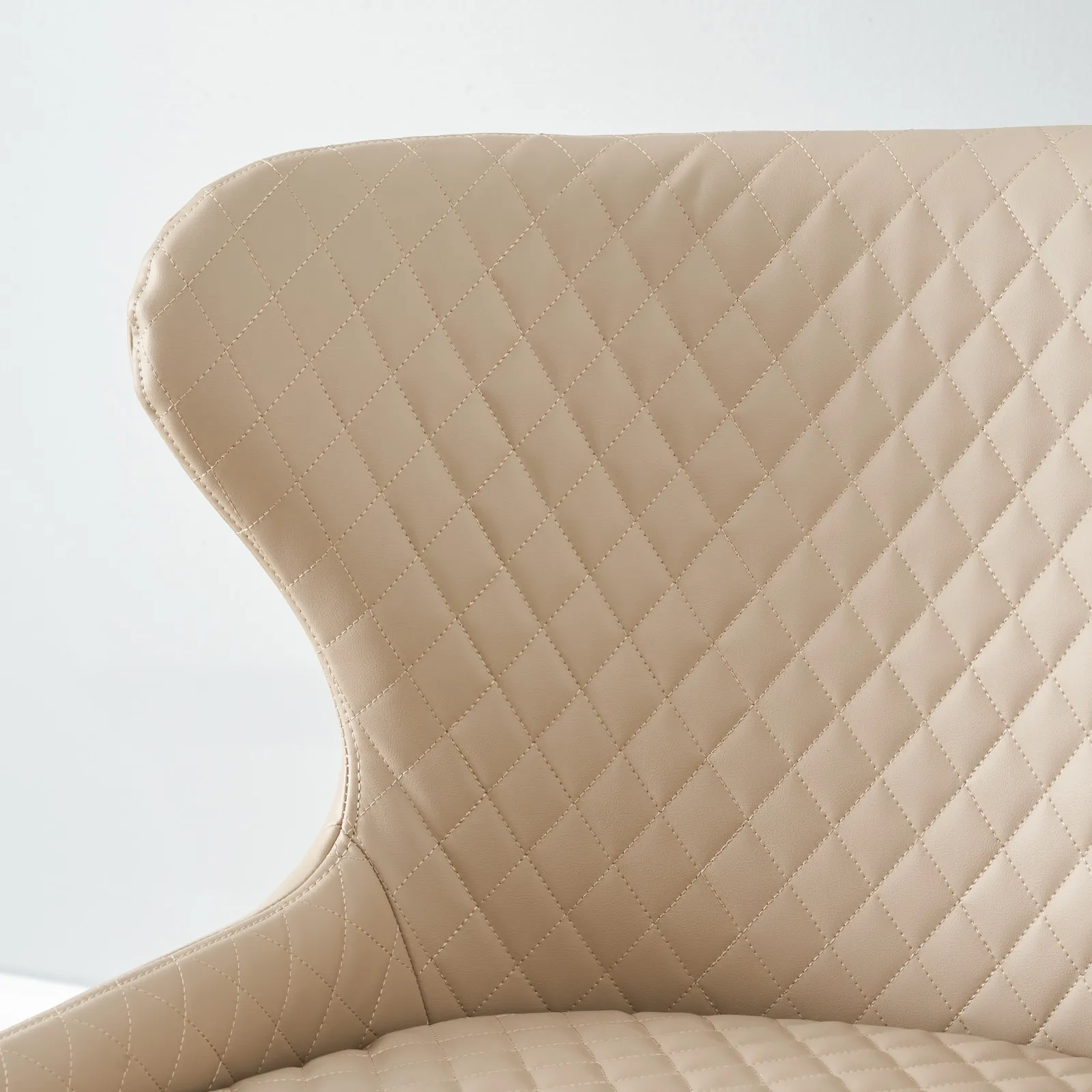Elevate your interiors with the Quinn Bar Stools, a splendid amalgamation of simplicity and elegance. The Quinn Sand Beige Vegan Leather Bar Stool is more than just a seat - it's a statement of style, featuring a sleek seat upholstered in exquisite sand beige vegan leather. The striking criss-cross motif adorning the fabric enhances the stool's allure, imparting a layer of opulence to its overall aesthetic. This unique presentation, with its art-deco-inspired design, seamlessly infuses a dash of vintage glamour into contemporary home settings.