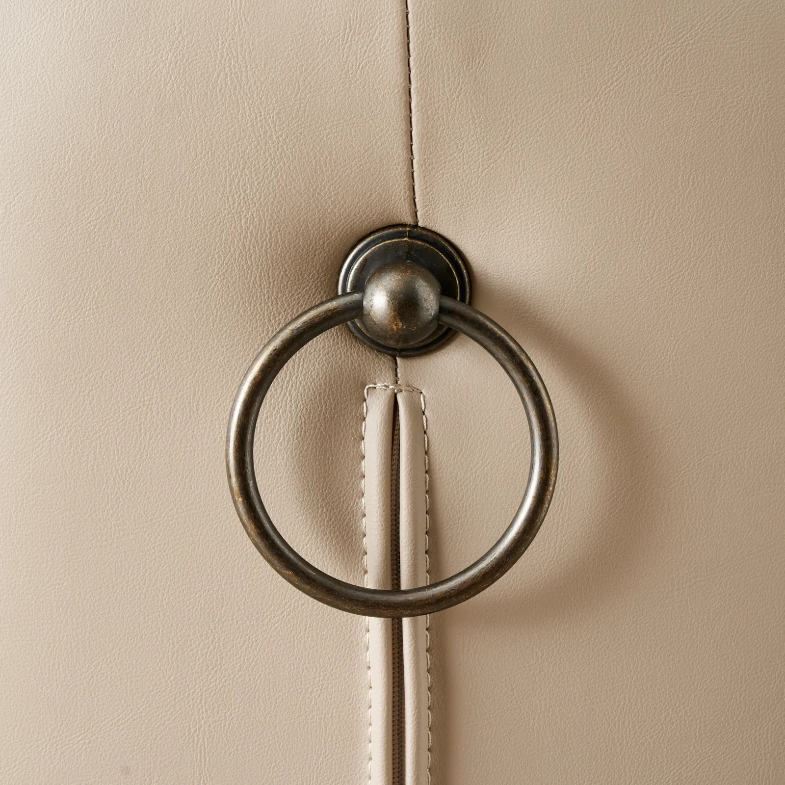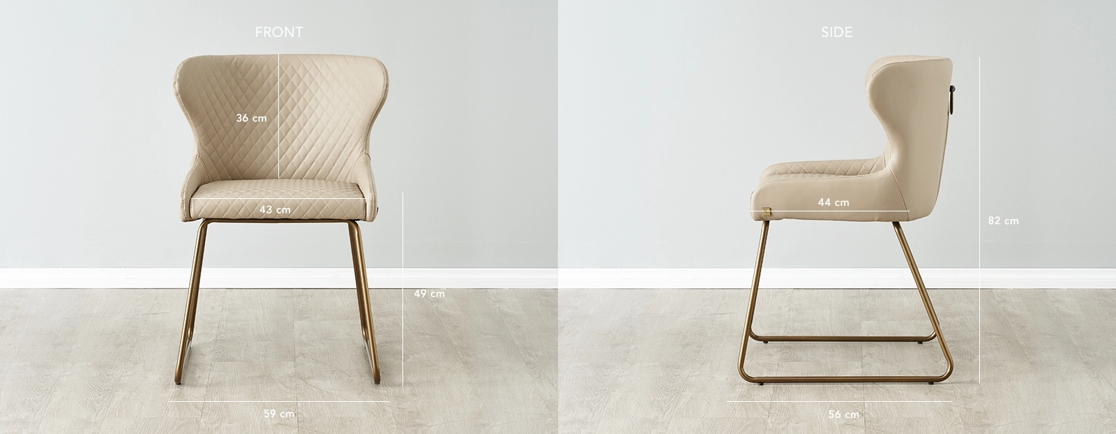 Elegant brass-coloured legs flow gracefully from the base, not only providing stability and support but also adding a touch of luxury to the Quinn Chair. The warm and lustrous brass finish complements the beige seat beautifully, creating a harmonious colour palette that exudes sophistication and refinement. To add a touch of character and uniqueness, a decorative pull ring is placed on the back of the chair. This small yet thoughtful detail adds a charming element to the overall design.