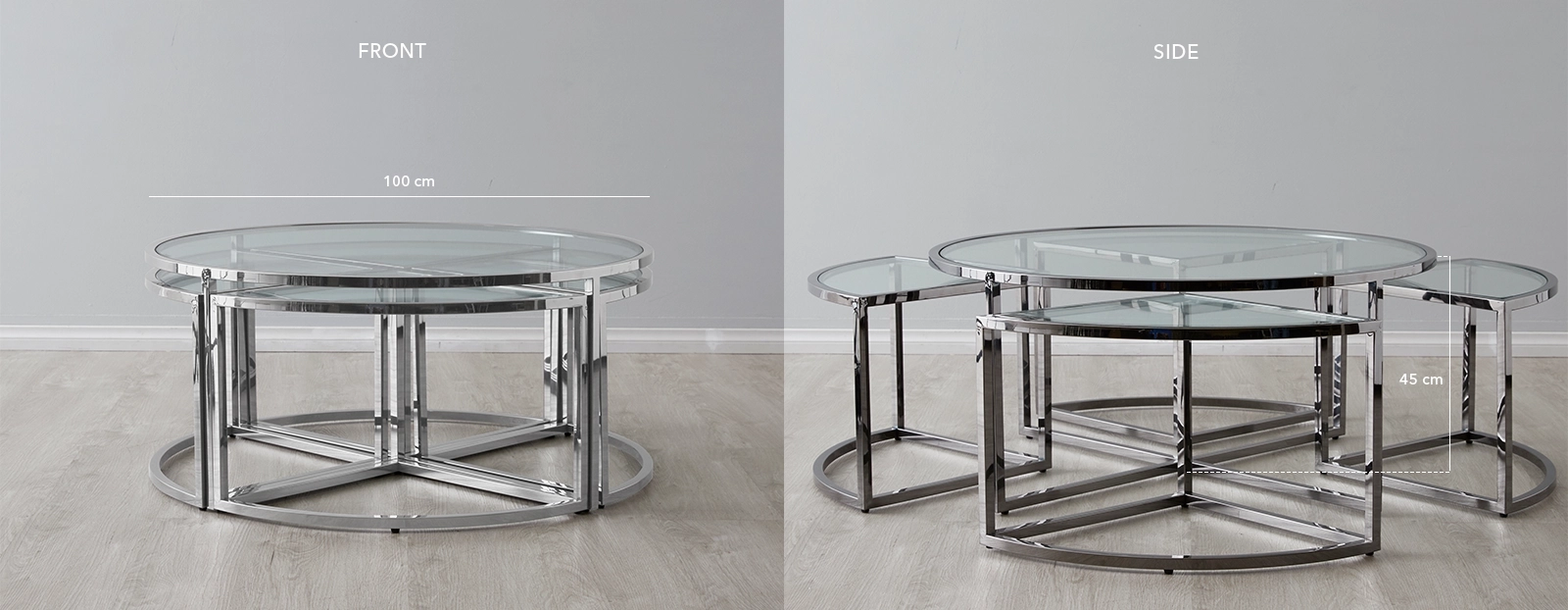The Raquelle II Coffee Table features a geometric design with four movable mini tables emerging from the circular center table. Made of stainless steel, it offers both utility and freedom.