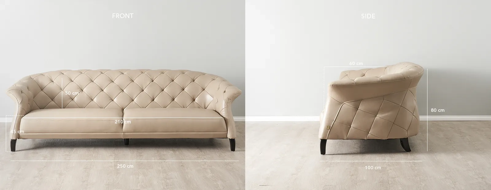 The Regal 3-Seater combines the elegance of Tuxedo and Chesterfield designs with an Art Deco flair. Its sleek curves and seamless backrest create a timeless, sophisticated look.