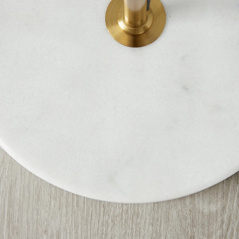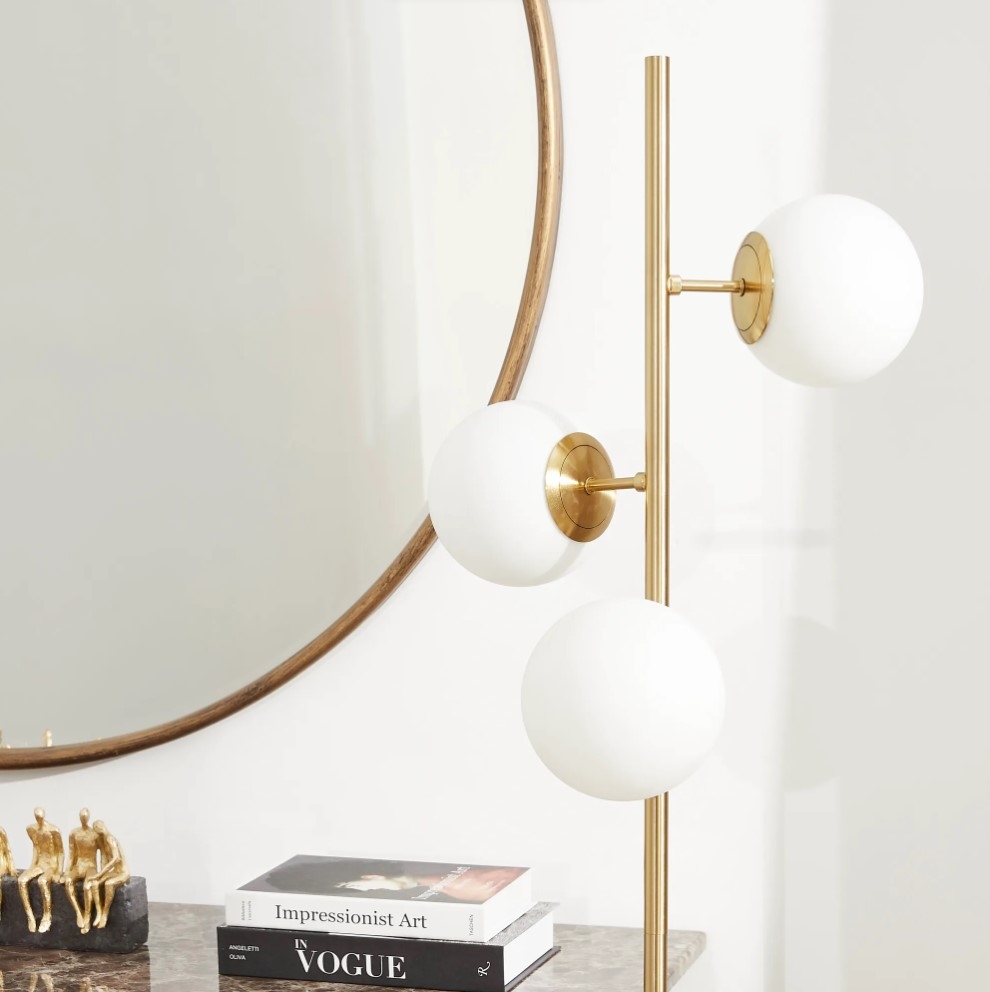 The spheres scatter light in multiple directions, creating a well-rounded glow that elevates the atmosphere. Unifying this ensemble is a stand of brushed gold, its own elegance mirrored by a stunning marble base. This marbled foundation not only provides stability but also imbues the piece with a touch of timeless sophistication.