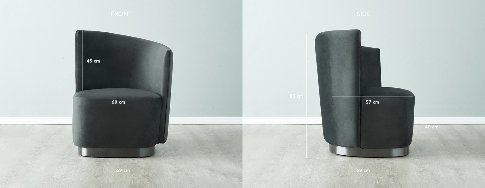 Challenge conventions with the Reina Chairs. The Reina Asymmetrical Charcoal Velvet Chair brings sophistication with its semi-curved backrest and stylish curves for a luxurious lounging experience.