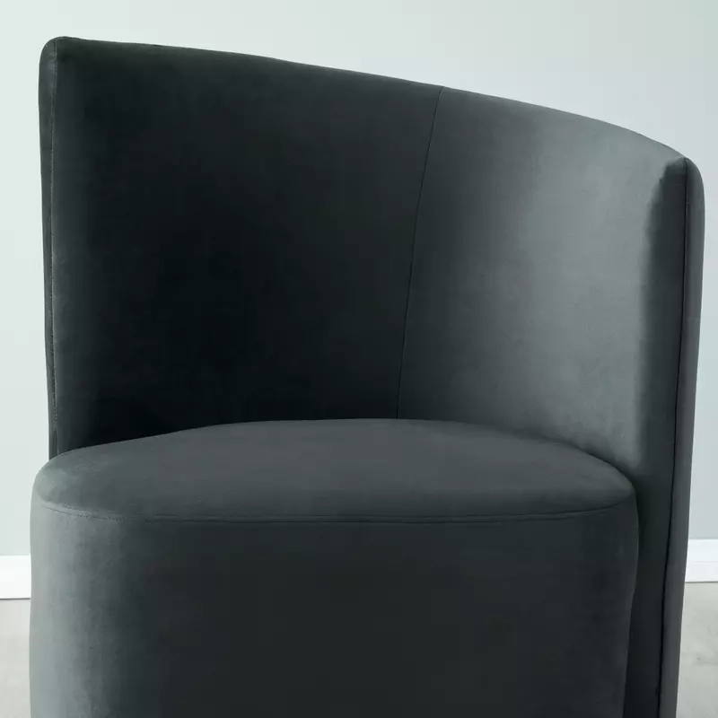 Upholstered in soft charcoal velvet, the Reina offers a dense foam-padded seat for ultimate comfort. Its brushed black nickel stainless steel legs provide stability and a sleek, modern touch.