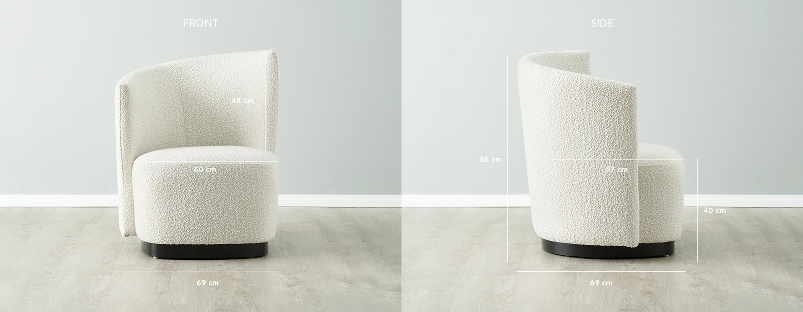 Upholstered in soft cream Boucle fabric, the Reina offers a dense foam-padded seat for ultimate comfort. Its black metal base provides stability and striking contrast, making it perfect to pair with its right and left apex variants.