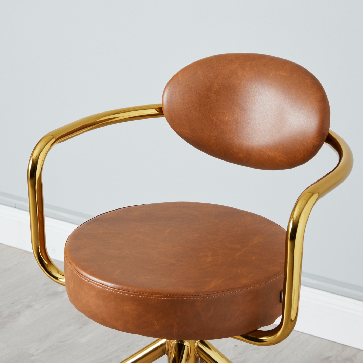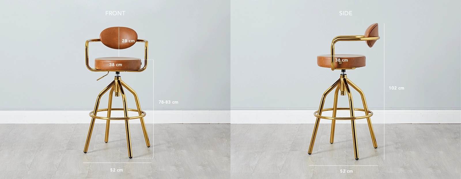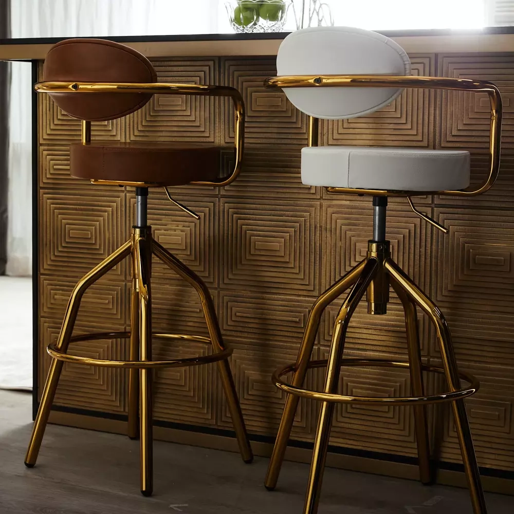 We invite you to satiate your luxurious tastes with our impressive line of Riva Bar Stools. They Boast a unique look reminiscent of art deco creations and an unmissable display of gold. The Riva Brown Bar Stool features a rustic and inviting Brown and gold colour scheme that permeates a modern rustic vibe. The seat and backrest are upholstered with high-quality vegan leather in that warm brown shade.