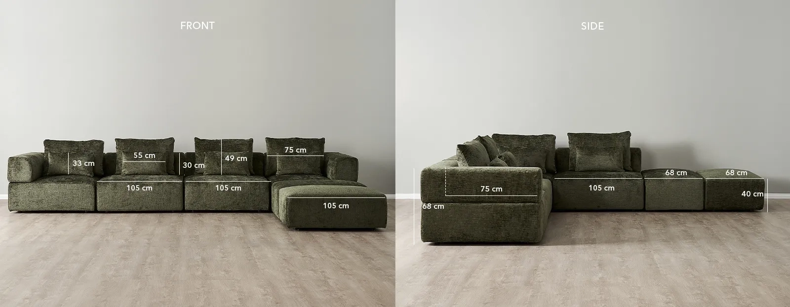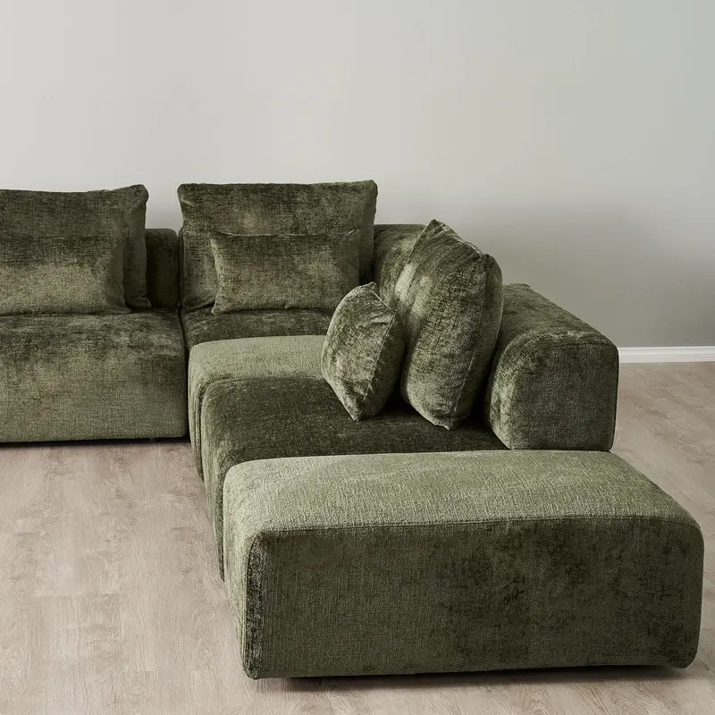The Riviera III Green Chenille Fabric Modular Sofa is upholstered in plush green chenille, offering a luxurious texture and a deep, inviting hue. Its rich, earthy tone brings a sense of warmth and character to any interior, creating a serene and stylish space for relaxation.