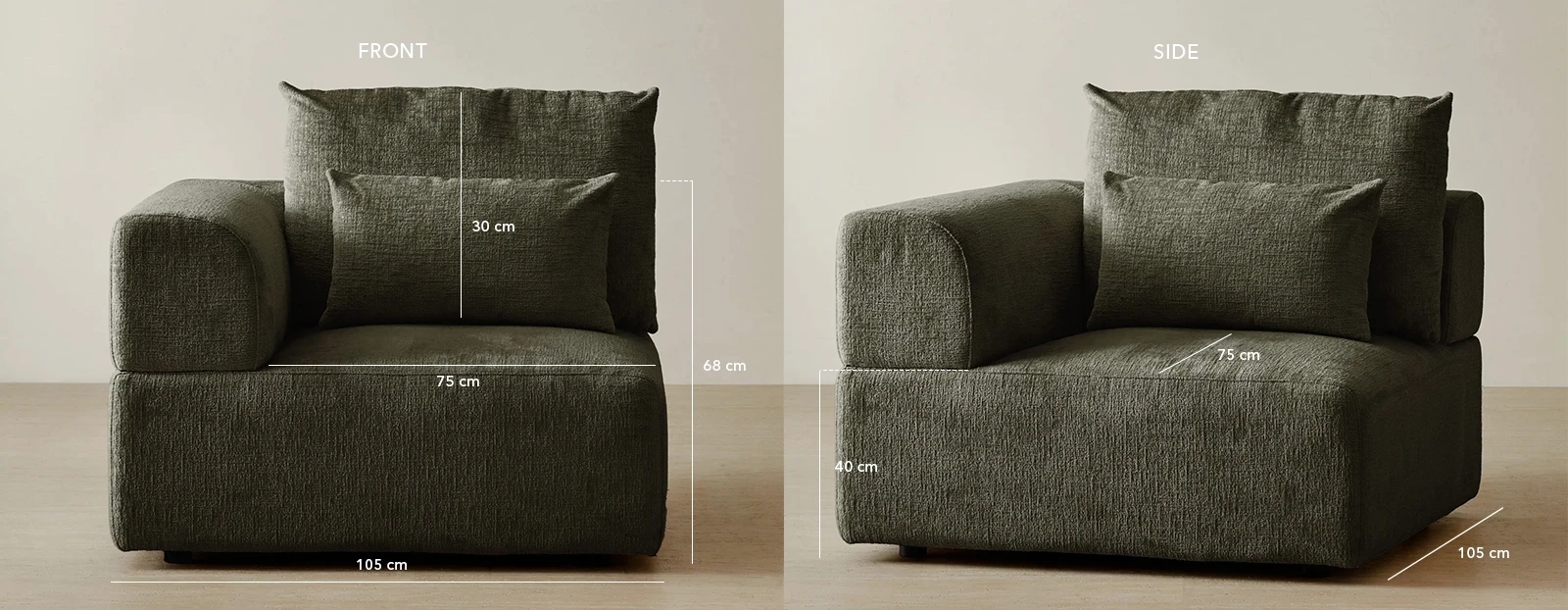 Clean lines and a structured corner silhouette give this piece a modern presence in any configuration. It comes with matching cushions that enhance comfort and maintain a cohesive look across your modular arrangement, perfect for compact spaces or expanding lounge setups.