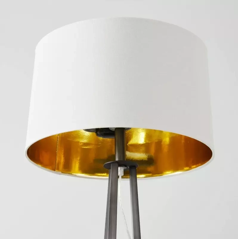 Topping this geometric marvel is a white shade, carefully chosen to counterbalance the frame's bold lines. Inside the shade, a gold lining casts a warm, inviting ambience, subtly enriching the room's atmosphere.
