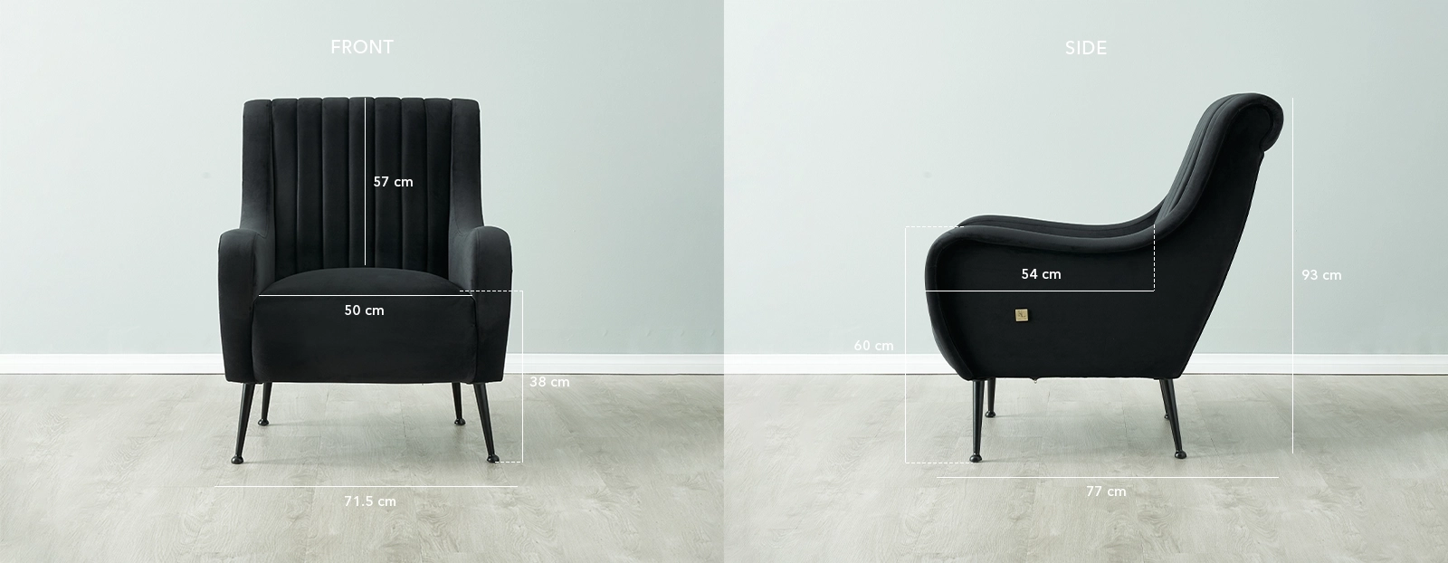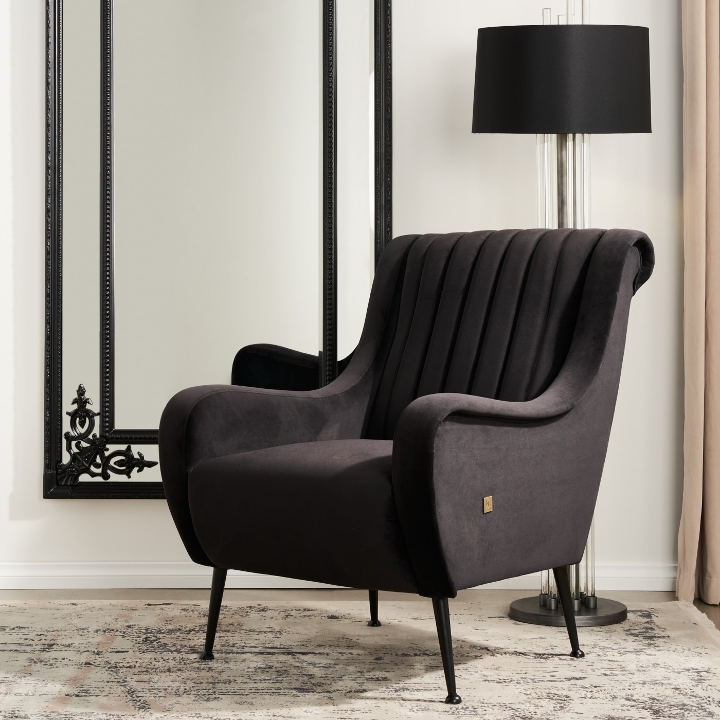 Upholstered in premium black velvet, the chair combines comfort with a luxurious aesthetic. Supported by four angled legs, it offers stability for relaxing in any position, making it both functional and elegant.